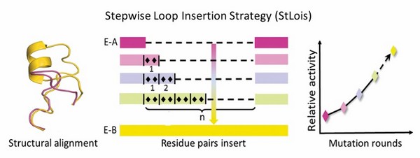 酶活性中心是实现高效、特异性生物催化的关键部位,对其柔性loop区的分子设计,可对活性中心微环境三维空间和残基化学组成产生重塑,进而有效驱动酶分子再进化,获得所需新催化功能。然而如何理性设计,有效引入新的多肽结构,在“老酶骨架”上产生新的催化功能,一直是酶学和蛋白质工程设计的难题。