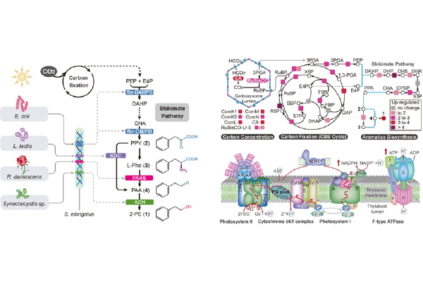 图2 左:苯乙醇人工合成途径示意图;右:碳代谢和光合电子链的可塑性