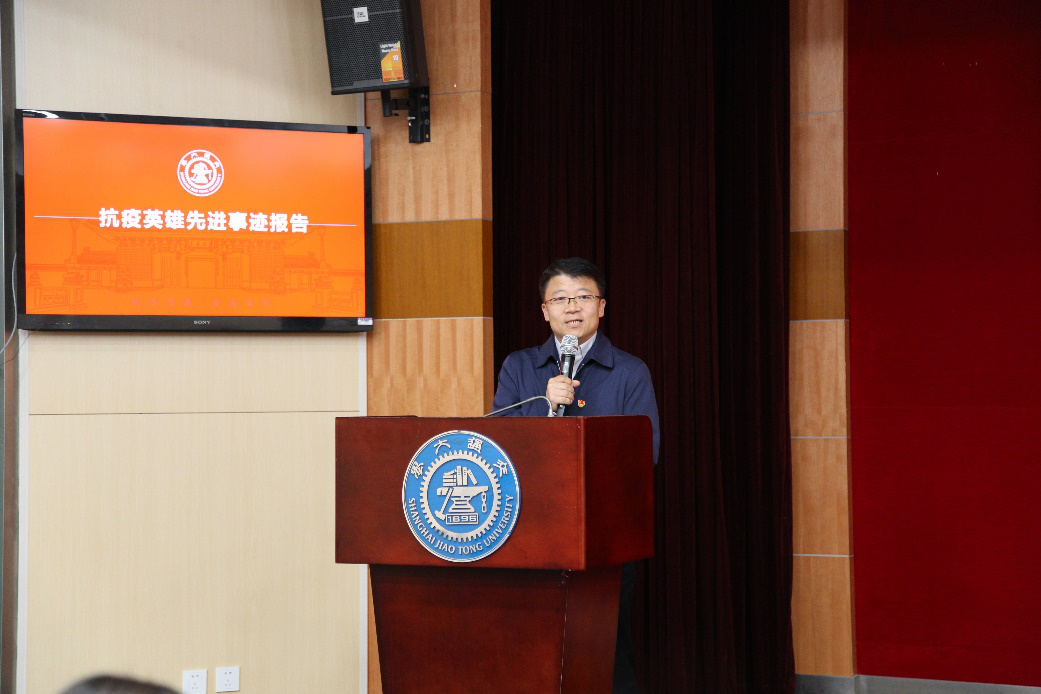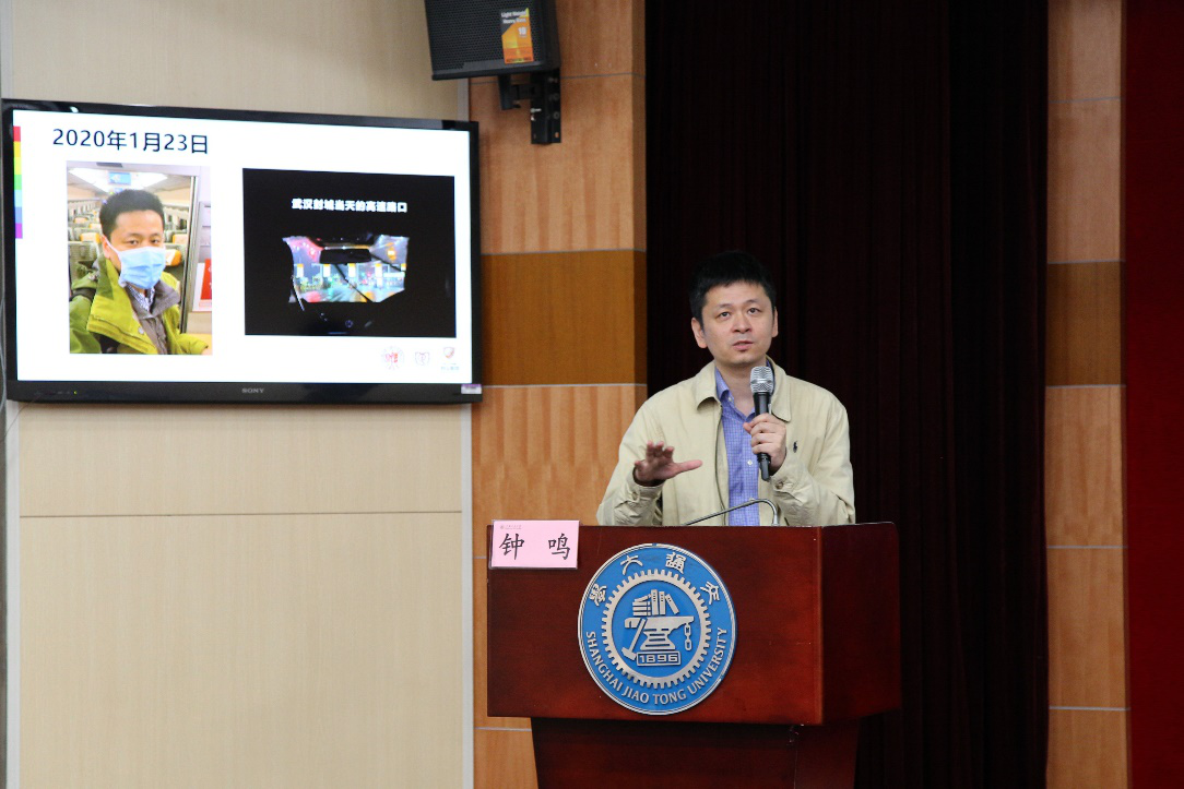 随后,钟鸣以“伟大抗疫精神指引我们胜利前进——我的武汉75天”为题作分享报告,为党员们上了一节生动的党课。2020年1月23日,钟鸣接受国家卫健委选派,赶赴湖北武汉参与新型冠状病毒感染肺炎的救治工作,成为上海首位援鄂“逆行者”。经历过SARS、参与过汶川抗震救灾的钟鸣医生,在面对这次史无前例的新冠疫情时,不惧挑战,主动担当,在最艰苦的环境中,坚守到了最后的胜利时刻,完成了党和国家交给的艰巨任务。他被授予“全国卫生健康系统新冠肺炎疫情防控工作先进个人”、 “全国抗击新冠肺炎疫情先进个人”、 “中国好医生、中国好护士”抗疫特别人物等光荣称号。钟鸣医生在报告中分享了自己在武汉疫情第一线的经历和感悟,强调在面临危难时刻,党员的精神和信仰是支撑我们的力量,扎实的业务能力是成功的关键,抗疫成功不仅仅靠先锋模范,最主要的力量来自于千千万万的人民,人民才是胜利的基石。我们要牢记“生命至上、举国同心、舍生忘死、尊重科学、命运与共”的伟大抗疫精神,时刻牢记党员的初心和使命。