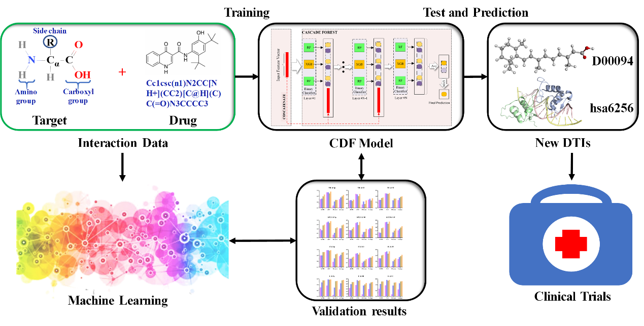 药物发现是识别具有潜在治疗作用的新候选化合物的过程,在此过程中,预测药物-靶标相互作用研究是一个必不可少的步骤。蛋白质是重要的药物靶标,药物通过与各种靶标相互作用在人体中发挥重要作用,可以增强或抑制其功能,发挥调控作用以达到治疗某一种疾病目的。因此,识别DTIs可以帮助理解药物的作用机制,对新靶点的发现、药物的重定位等有着至关重要的作用。此外,由于DTI的实验确定既耗时又耗费资源,现有的方法和工具还有诸多缺陷和不足,因此非常需要开发高效的计算方法,以充分利用已知DTI的异质生物学数据来厘清药物在人体中的作用机理。在过去的几十年中,已经开发出许多用于预测DTI的计算方法,但是尚存在精度低、假阳性高等问题。