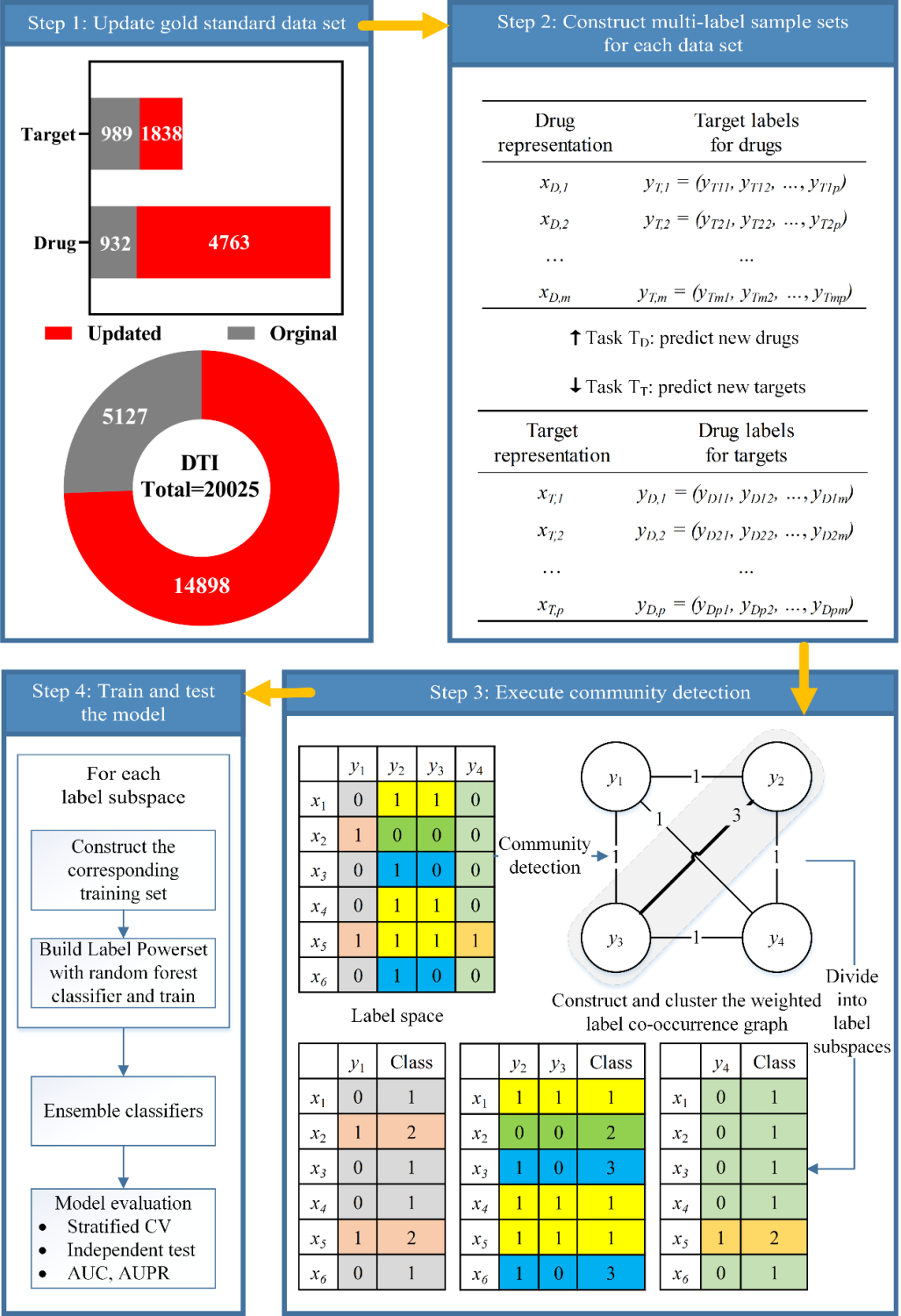 在DTI预测问题上,魏冬青课题组于2019年12月曾在《Briefings in Bioinformatics》在线发表了“DTI-CDF: a cascade deep forest model towards the prediction of drug-target interactions based on hybrid features”( https://doi.org/10.1093/bib/bbz152),发展了深度级联森林的人工智能方法DTI-CDF(图2),在小样本量数据的情况下可获得性能媲美或优于深度学习的结果。随后,进一步提出了多标签分类框架DTI-MLCD(图3),避免了冗余特征空间和高特征维度导致的过拟合等问题,并且可以一次预测药物或靶标的一系列相互作用。此外,魏冬青课题组更新了2008年建立的金标准数据集,将数据量增加了3倍,并公开了数据集更新的代码,以便于其他科研人员随时更新,并使用最新代码进行科学研究。最重要的是,根据该课题组研究建立的AI药物筛选平台,筛选出了新冠病毒的有效的中药有效成分抑制剂和多肽——人肠防御素5 (HD5),获得钟南山院士团队和合作单位陆军军医大学王军平团队的实验验证(魏冬青为共同通讯作者的论文成果发表在消化病学顶级期刊《Gastroenterology》,https://doi.org/10.1053/j.gastro.2020.05.015)。
