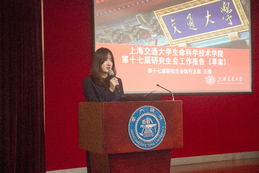研究生会主席团成员王倩作《第十五次研究生代表大会工作报告》。她从多角度全方面总结了过去一年研究生会的工作,回顾了工作进程,并对未来一年的研会工作提出建议。