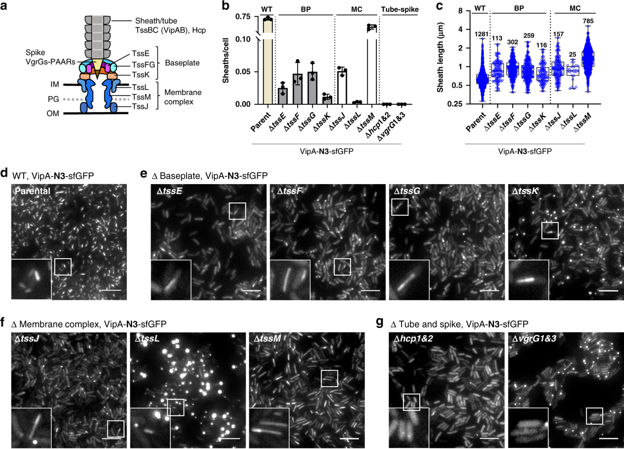图1. T6SS sheaths assemble in membrane complex and baseplate mutants