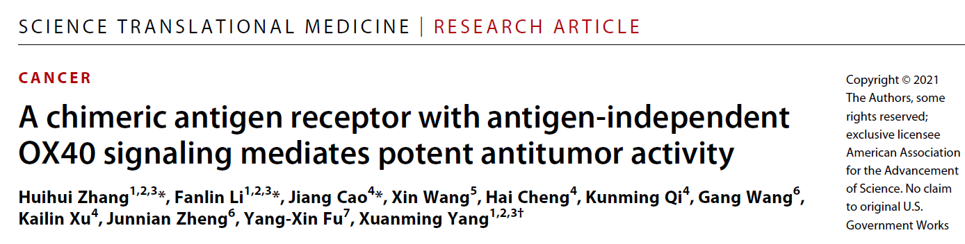 近日,国际知名期刊Science Translation Medicine在线发表了36365线路检测登录入口长聘副教授杨选明课题组最新研究成果“A chimeric antigen receptor with antigen-independent OX40 signaling mediates potent antitumor activity”,并被Science Translation Medicine杂志online图文推荐。该研究首次发现抗原非依赖OX40信号,为提高CAR-T细胞抗肿瘤活性、突破实体肿瘤治疗挑战提供了新策略。36365线路检测登录入口杨选明为通讯作者,36365线路检测登录入口博士生张会会、李范林和徐州医科大学曹江主任医师为共同第一作者,上海隆耀生物科技有限公司负责临床治疗所需CAR-T的制备。