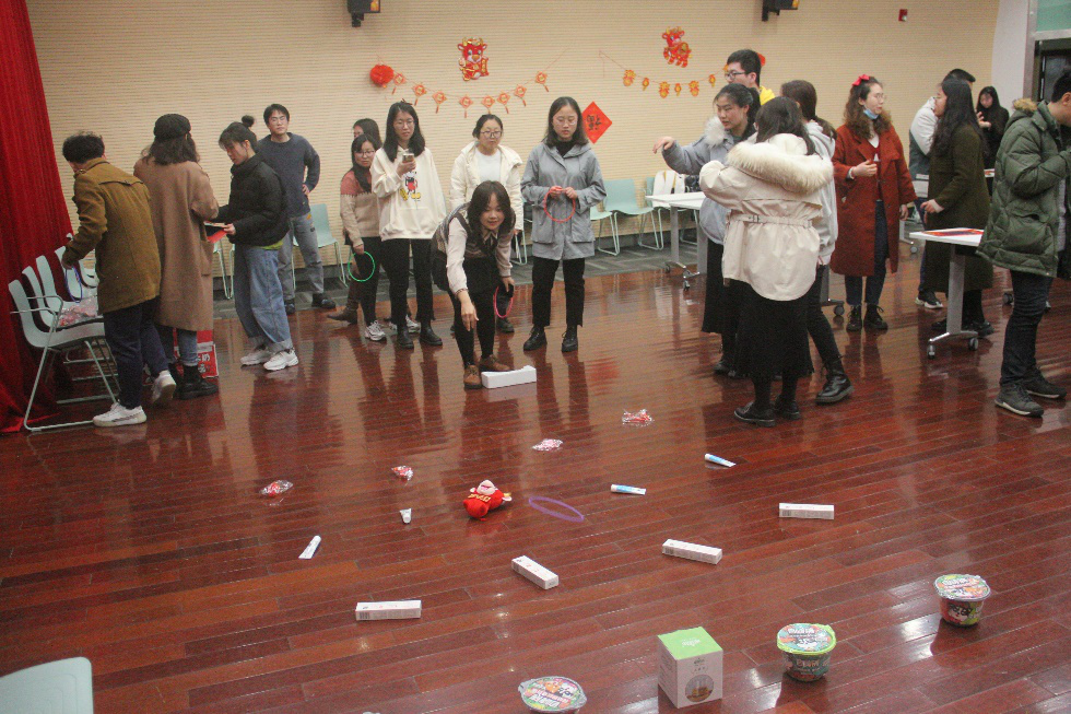 活动伊始,主持人介绍各地元宵风俗后,参与师生按地域分为“南方队”“北方队”两队,面对现场提前布置好的四十个灯谜,各队开动脑筋、积极参与。答对灯谜,参与“套圈”活动,无限试吃全场家乡特产。最终答对数目多的“北方队”优先挑选汤圆馅料。