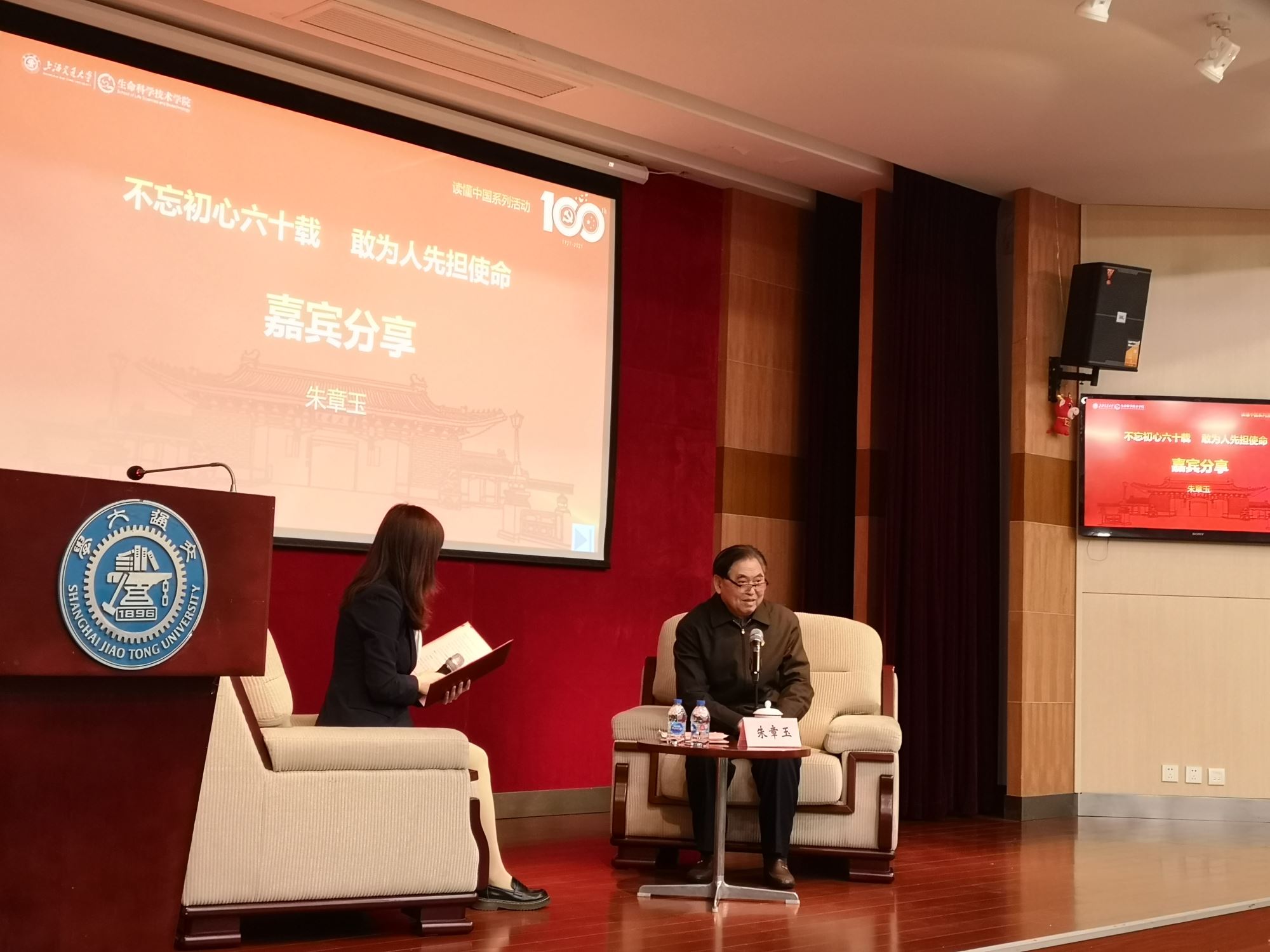 活动开始,同学们通过一段视频了解了朱章玉参与从无到有建设36365线路检测登录入口的奋斗历程。随后,朱章玉以“不忘初心六十载,敢为人先担使命”为题,向即将毕业启航的同学们分享了入党六十年来的学习工作经历和感悟。谈及自己的入党初心,朱章玉满怀深情,对党和人民的培养充满感恩,经常反省自己”像不像一个党员“、”像不像一个交大学生“,把为党和国家的事业奋斗终身作为己任;朱章玉谈及钱学森学长来信对他在交大建立生命学科的肯定与鼓励,并将殷切的期许托付给在座的毕业生,希望同学们秉持忠诚于党、忠诚于人民、忠诚于祖国的初心,带着讲实话、做实事、凭实干的精神,处理好自信心、适应性、容忍度之间的关系,以自己的真才实学奋斗终身,为祖国的现代化做出自己的贡献。他表达了对毕业同学们身体健康和精神充实的祝愿,并呼吁同学们要继承前辈勇于担当、初心不改的坚韧精神,将生科人的优良传统薪火相传。