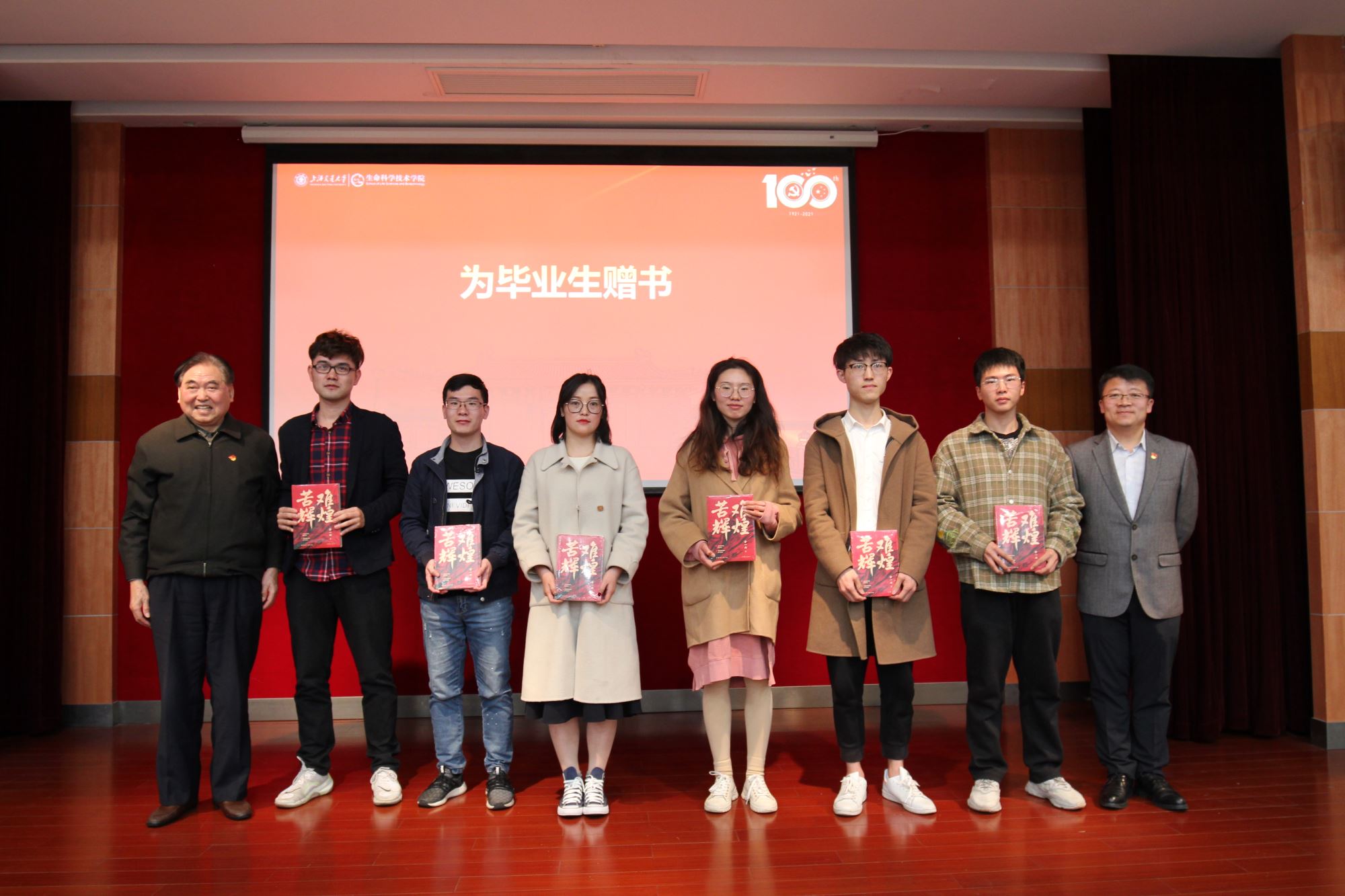会上,学院与毕业生互赠礼物。为鼓励同学们积极开展党史学习,用党的实践创造和历史经验启迪智慧,学院为毕业生赠送经典书籍《苦难辉煌》,并为每位毕业生定制刻有学院名字和学生姓名的个性化戒指。为感谢学院的悉心栽培,2021届研究生精心准备了一幅写有“筑梦生科,扬帆起航——建党百年之际,祝福学院桃李满天下” 的画。画布上留存的是2021届研究生缤纷错落的彩色手印,寓意生科人携手奋进,共同撑起肩上重任的志向与胸怀,承载着毕业生对学院桃李满天下的美好祝愿。