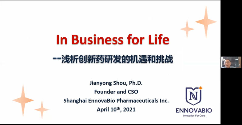 校友寿建勇现任轶诺药业有限公司CSO。他以“In Business for Life——浅析创新药研发的机遇和挑战”为题作报告,系统介绍了新药研发行业的总体生态环境,解读了新药研发产业中存在的问题,指出了中国创新药物研发中的机遇,并针对行业的发展分享了自己的思考。