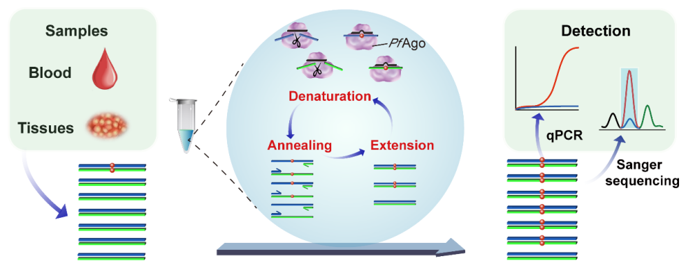 对血液或体液中肿瘤细胞释放DNA片段的液体活检,凭借其无创性、敏感性、动态性等特质,可实现肿瘤早期筛查及伴随诊断。然而,由于游离核酸含量低和易降解,因此在复杂背景基因中来特异性富集和检测肿瘤基因得到广泛关注。常用的PCR等方法具有简单、省时等优点,但其检测灵敏度有限;近年来,基因编辑工具酶CRISPR/Cas在核酸检测中的应用,提升了检测灵敏度和便捷性,但Cas酶对靶标序列PAM选择性、长RNA guide合成昂贵且不稳定等问题,导致检测成本、灵敏度、多重性等方面仍存在局限性。因此,研发能特异性富集靶标序列的新型核酸酶是解决上述难题的有效途径,建立高灵敏度、多重和简便的新型核酸检测技术对于基础研究和临床应用都具有重要意义。