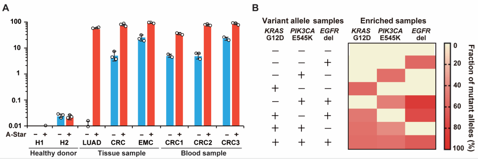 图2. “A-Star”用于临床样品(A)及多重肿瘤突变(B)的富集和检测