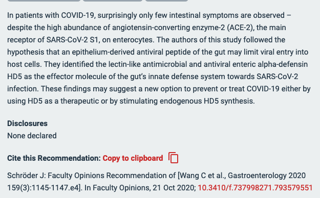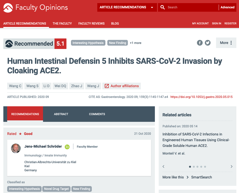 36365线路检测登录入口魏冬青教授团队在国际权威期刊《Gastroenterology》发表的论文“Human Intestinal Defensin 5 Inhibits SARS-CoV-2 Invasion by Cloaking ACE2” 被列为世界学术组织“Faculty Opinions (原F1000Prime)”推荐论文,并由德国基尔大学的免疫学专家Jens-Michael Schröder教授进行点评,评论指出了该项工作给预防或治疗新冠肺炎提供全新途径—既可以使用HD5作为治疗药物,也可以通过刺激内源性HD5的合成来预防或治疗。