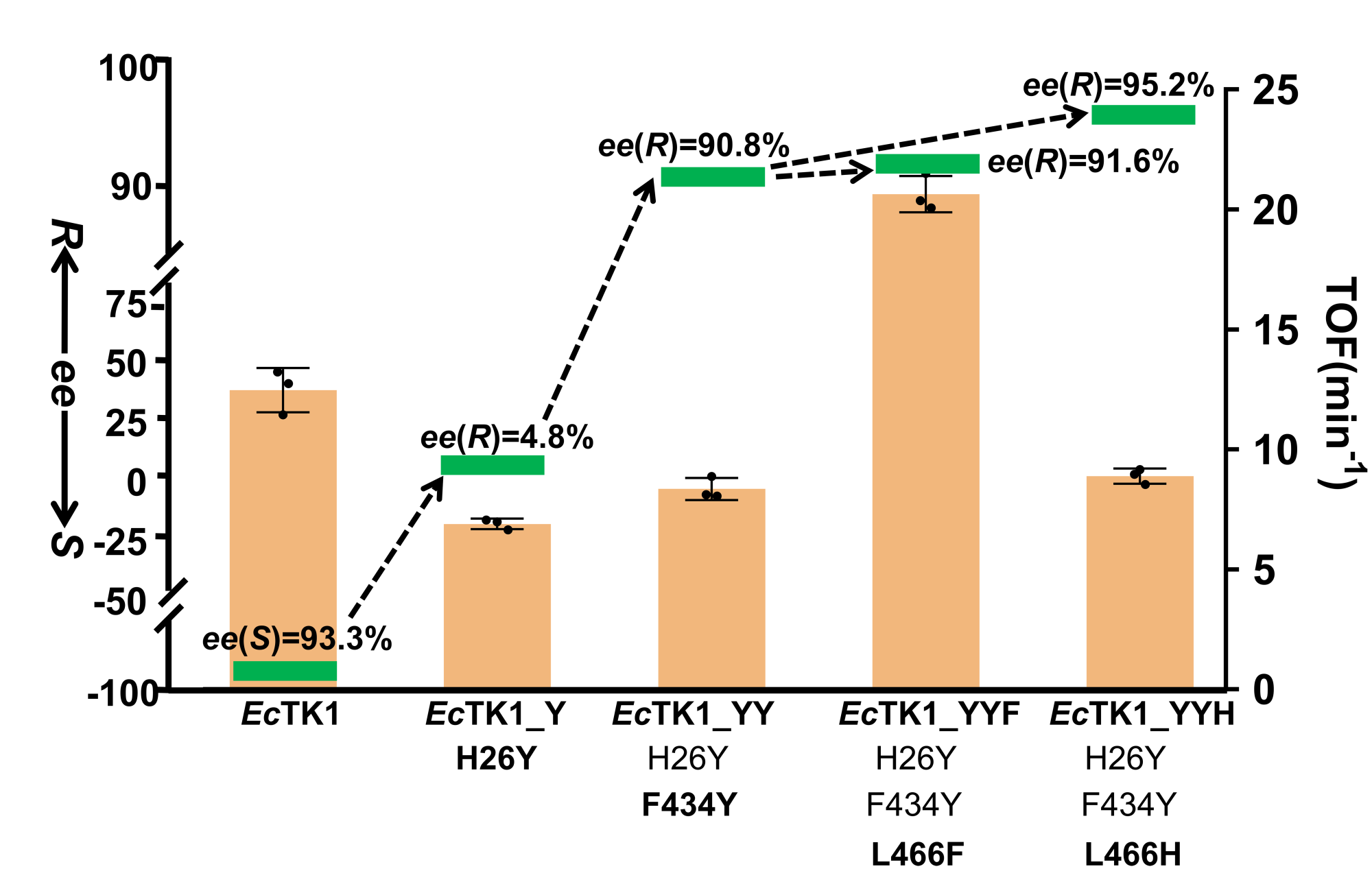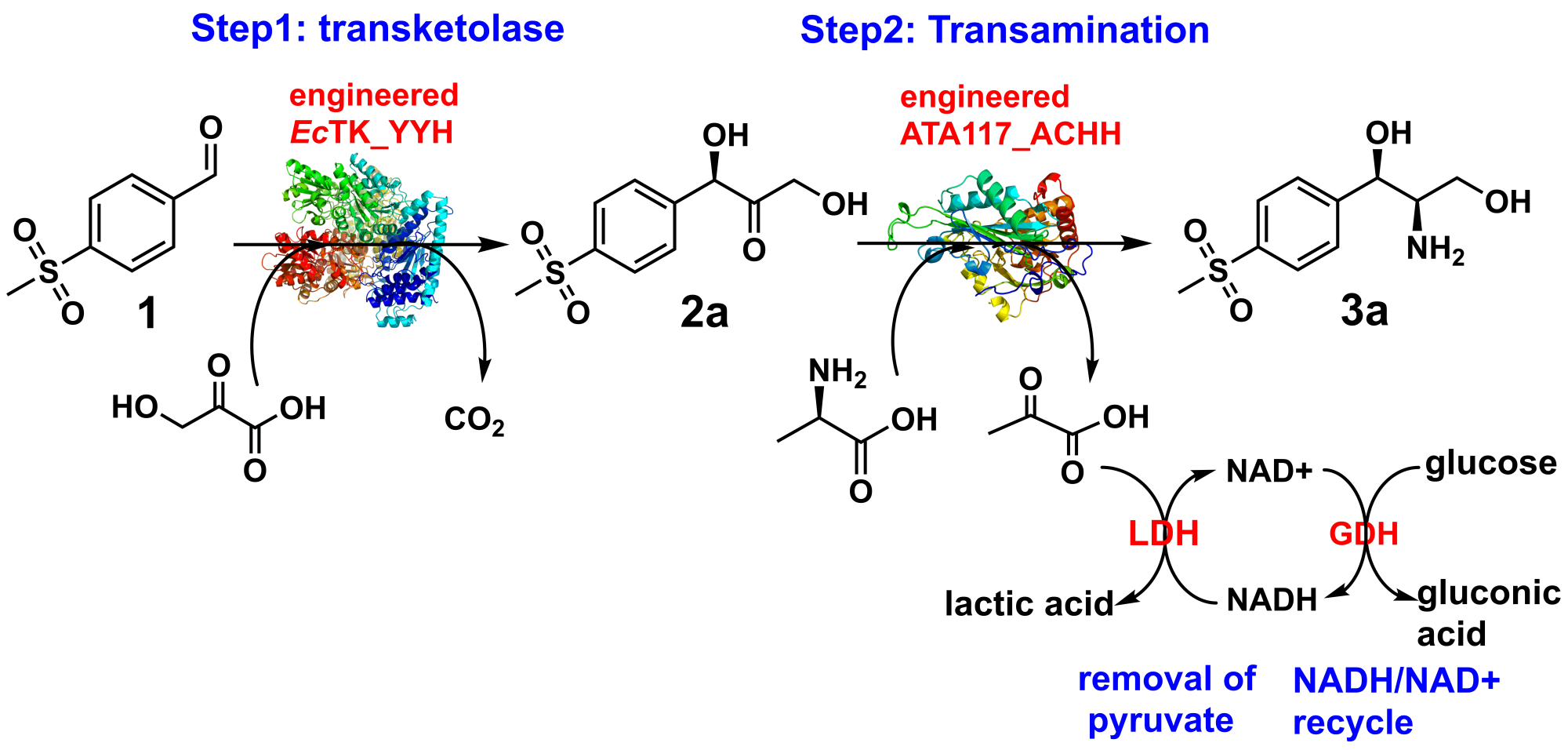在对转酮酶和转氨酶催化机制和蛋白结构认识基础上,利用分子对接手段建立了酶-底物结合模型,并基于此设计半理性突变策略,翻转了转酮酶的立体选择性,转氨酶的对映体偏好性和醛酮选择性,进而偶联转酮酶和转氨酶突变体一锅法合成了末端羟基手性中间体(1R,2R)-对甲磺砜基苯丝氨醇,产率可以达到76%,非对映体选择性最高为96% de 和对映体选择性> 99% ee,为氟苯尼考的制备提供了最直接的手性中间体。