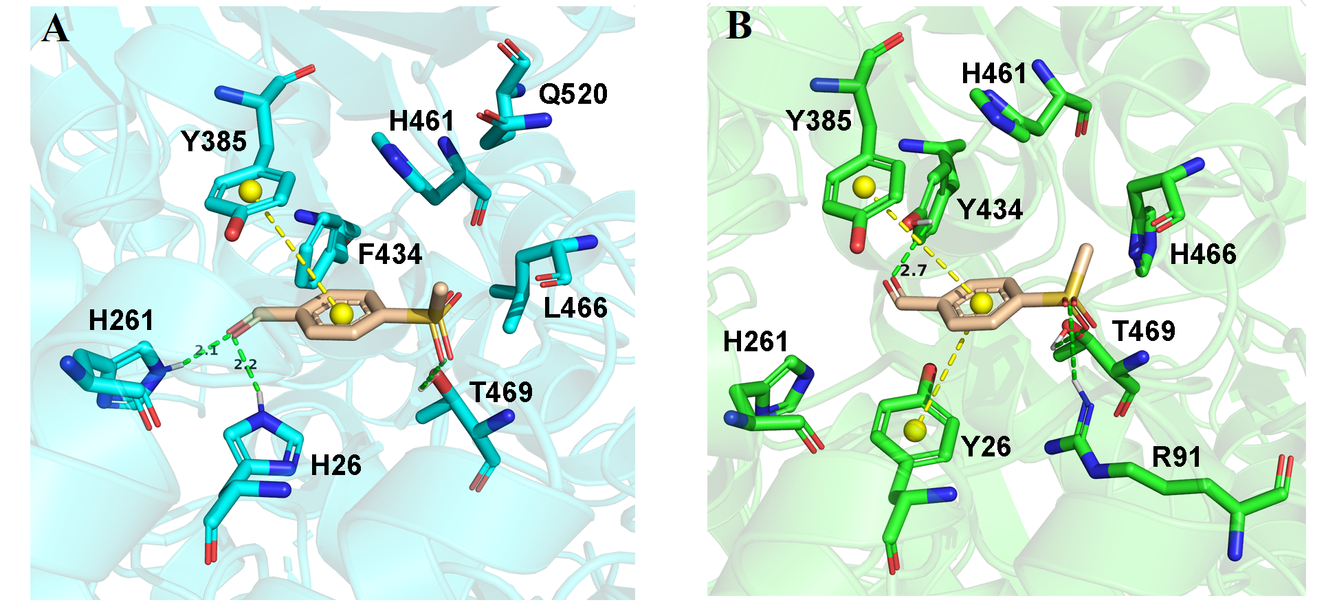 图2. 转酮酶EcTK1 (A)和EcTK1_YYH (B)与醛1的分子对接