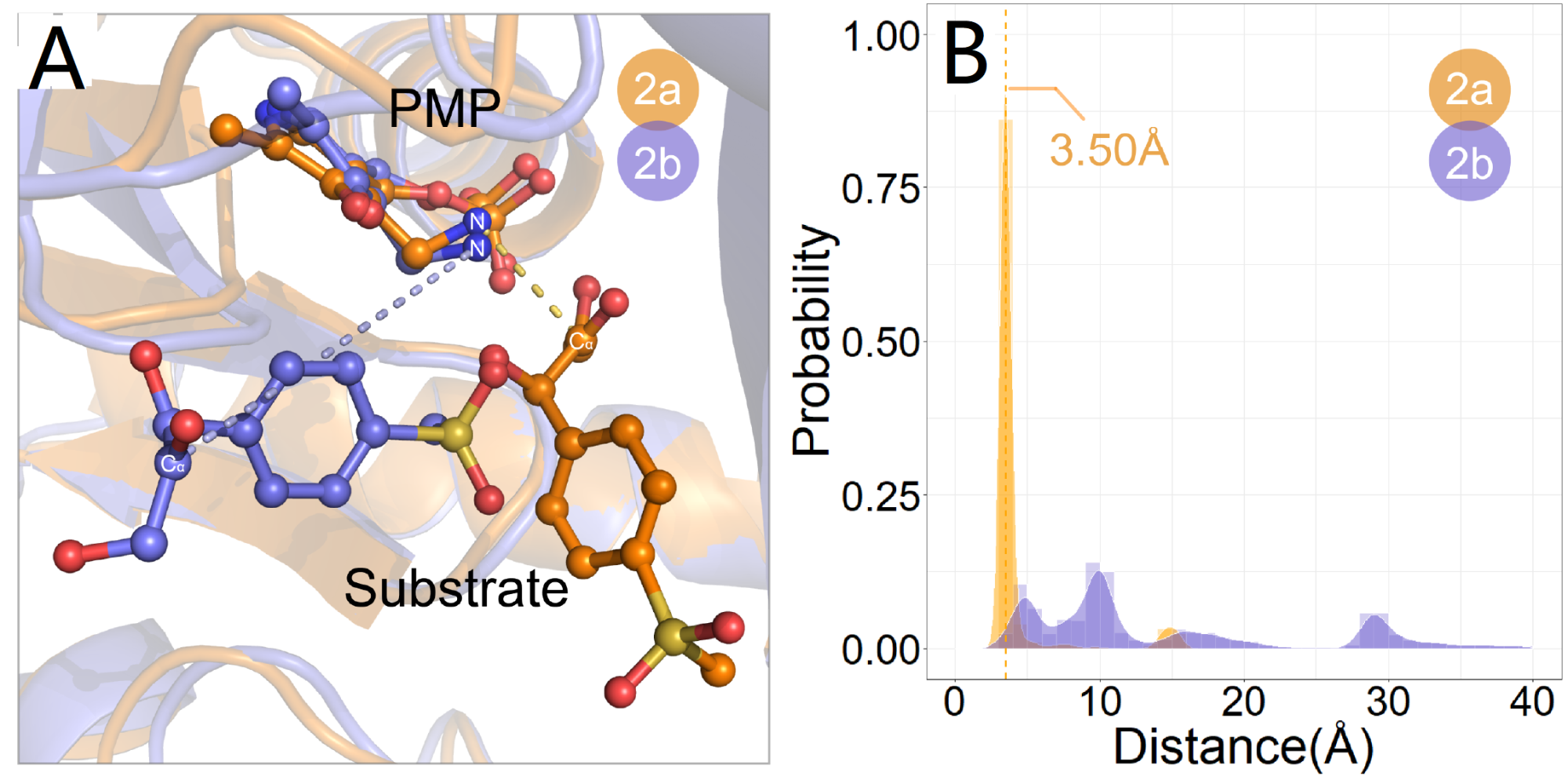 在实现转酮酶的立体选择性翻转后,作者基于R-2底物与ATA117_AC的分子对接,对转氨酶作了迭代饱和突变,筛选所得突变体ATA117_ACHH翻转了对手性羟酮中间体2的对映体偏好性和醛酮底物选择性,即从野生型ATA117对S-酮的偏好性(Es=8.5)翻转为突变体ATA117_ACHH对R-酮的偏好性(ER=11.7) (如图3所示);从野生型ATA117对醛的偏好性翻转为突变体ATA117_ACHH对酮的偏好性。为了考察ATA117_ACHH对R-酮的偏好性,分别作了ATA117_ACHH与-S酮2b和R-酮2a的分子动力学模拟,证实氨基供体PMP的氨基与R-酮的羰基距离在3.5Å左右,而与S-酮羰基距离为10-30Å (如图4所示)。