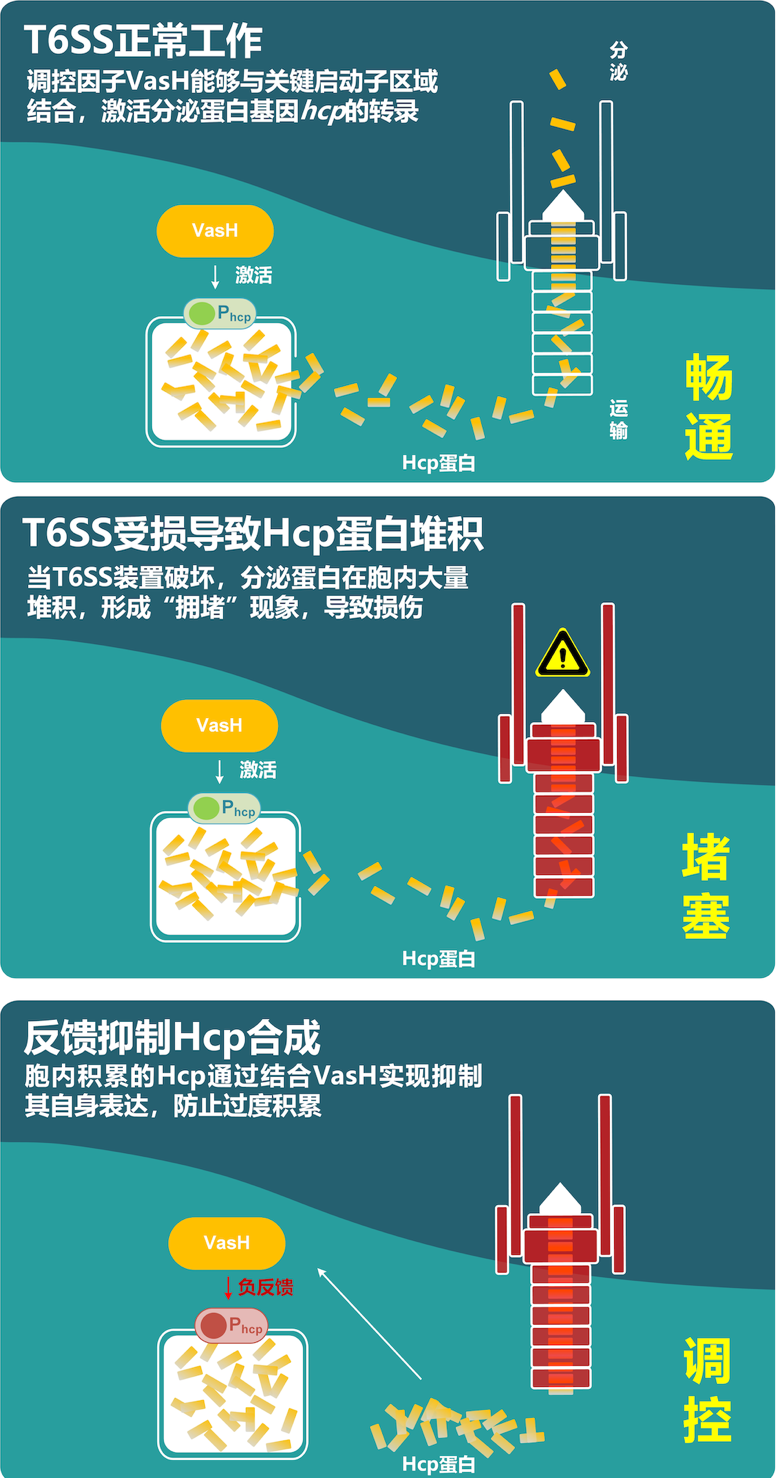 论文具体研究的是细菌Ⅵ型分泌系统(T6SS),它是一种广泛存在于革兰氏阴性致病菌的针状“武器”。在环境中,拥有T6SS的细菌可以通过直接接触的方式,将不同毒性或功能的效应蛋白注射到周边其他微生物或真核宿主体内。每次分泌可以将上千个蛋白弹射出去,而新一轮的分泌需要蛋白的重新合成。如果分泌系统出现问题,分泌蛋白会在细胞内大量积累,形成“拥堵”现象,这不仅损耗大量能量,还可能因为毒素蛋白的积累对细胞造成损伤。本研究所发现的感应胞内蛋白积累的调控机制,可以减少蛋白的无效合成并优化分泌效率。