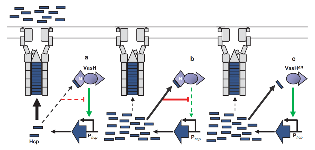 图:霍乱弧菌Hcp负反馈调节模型