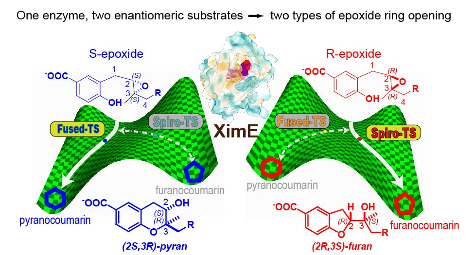 近日,美国化学会催化领域顶级期刊《ACS Catalysis》在线刊发了36365线路检测登录入口、微生物代谢国家重点实验室赵一雷教授团队在酶催化分子机制研究上的最新进展,“Computational Exploration of How Enzyme XimE Converts Natural S-Epoxide to Pyran and R-Epoxide to Furan”。该工作阐明了厦门霉素生物合成途径中XimE环化酶的独特催化机制,揭示了两种相反手性的环氧化底物在酶催化下分别合成苯并杂环衍生物呋喃香豆素和吡喃香豆素两种不同环化产物的微观过程,这种二分杂合特性填补了酶分子生物进化过程特异性转化的关键一环。