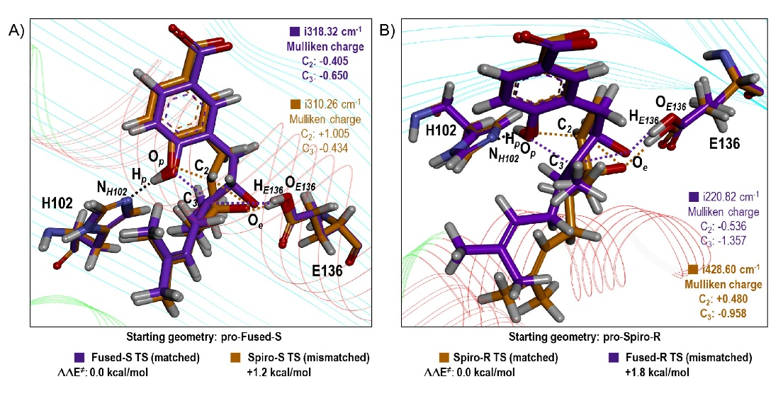 长期以来,特异性和效率被认为是生物催化剂酶的一个重要特征。然而,最初在厦门霉素生物合成中发现的类SnoaL环化酶(XimE)不仅能够催化上游基因XimD产生的天然环氧化物代谢物的吡喃环化反应,而且可以增强非天然环氧化物异构体的呋喃环化反应。课题组通过理论酶簇模型、预反应态和后反应态MD模拟、ONIOM过渡态计算和QM/SCRF(VS)介电常数扫描阐明了XimE中独特的底物控制酶功能的反应机制。两条催化途径具有类似的广义酸碱催化机制,皆由E136和H102分别充当质子供体和受体,融合型过渡态合成吡喃产物而螺型过渡态则合成呋喃产物。其催化的区域选择性源自酶与两种过渡态之间的诱导契合作用,这种底物-酶的相互作用可以延续到酶-产物复合物中,控制了不同产物的催化效率。XimE显然与上游XimD环氧化物酶产生的天然S-环氧化物底物一起进化,偶然地通过相近的广义酸碱催化机制催化对映体R-环氧化物的另一类环化反应。
