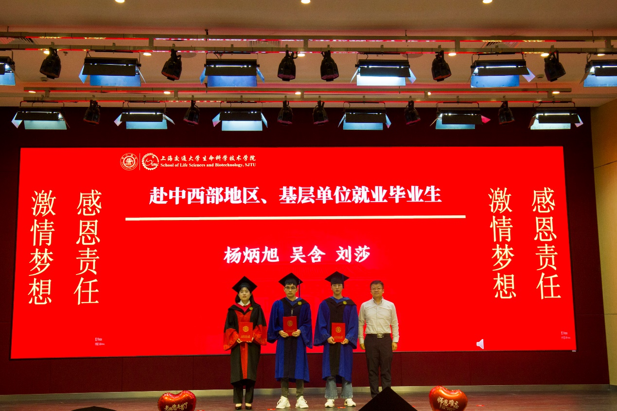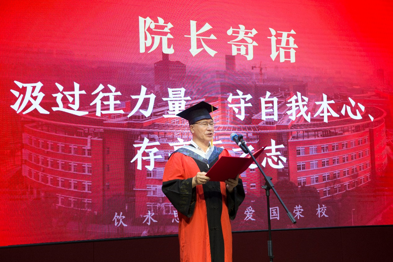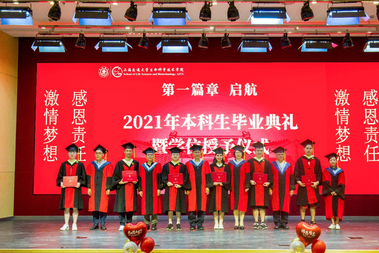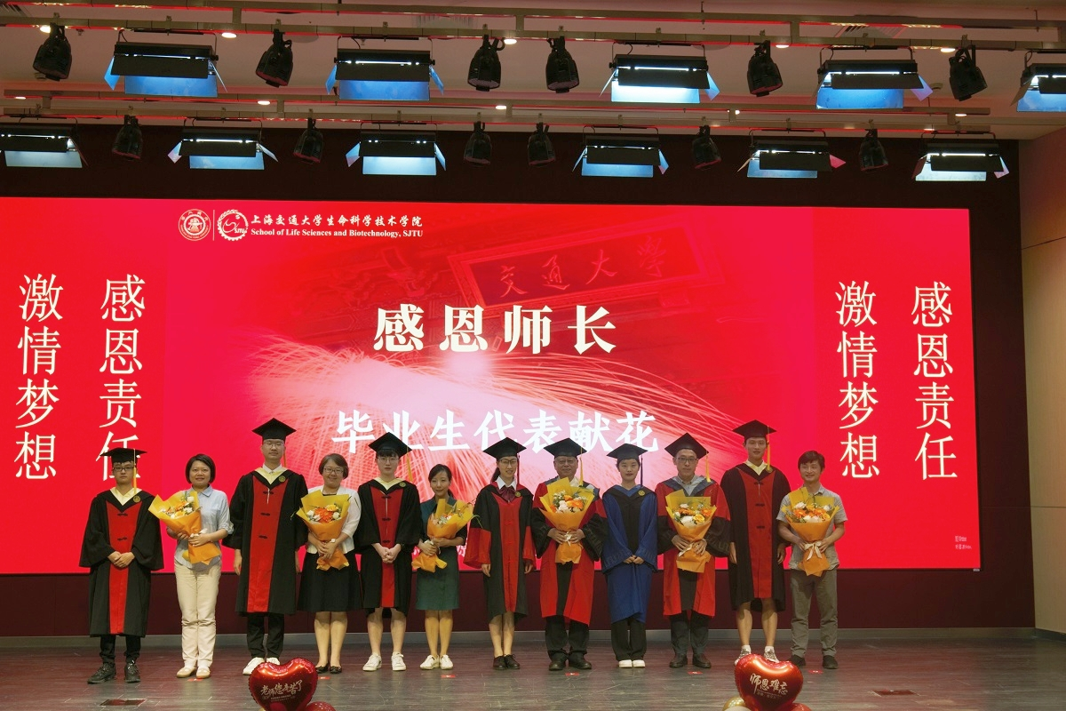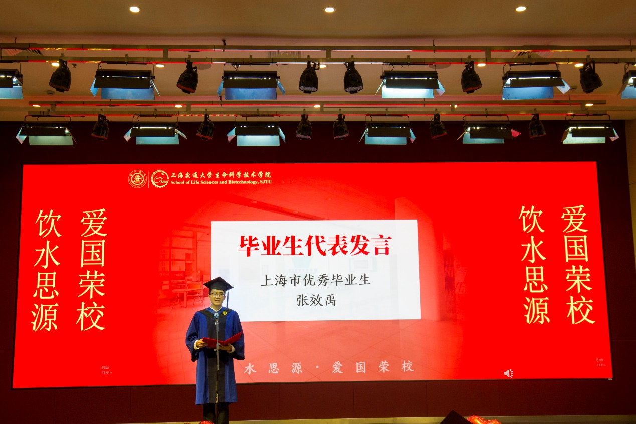 研究生代表、上海市优秀毕业生张效禹发言。他回顾了自己在交大学习的点点滴滴,对导师的教导、老师们的栽培以及亲友们的支持表示感谢。他号召同学们牢记生科人的初心和使命,砥砺奋进以求祖国繁荣昌盛,用实际行动践行爱国誓言。本科生代表、上海市优秀毕业生蒋韵哲发言。他对学院、学校的培养表示感谢,并表示,大学四年,不仅获得了知识,还形成了追求卓越的思想,养成了热爱学习的习惯,形成了科学严谨的态度。他号召每位同学都能笃行致远,为实现中华民族的伟大复兴做出自己的贡献。