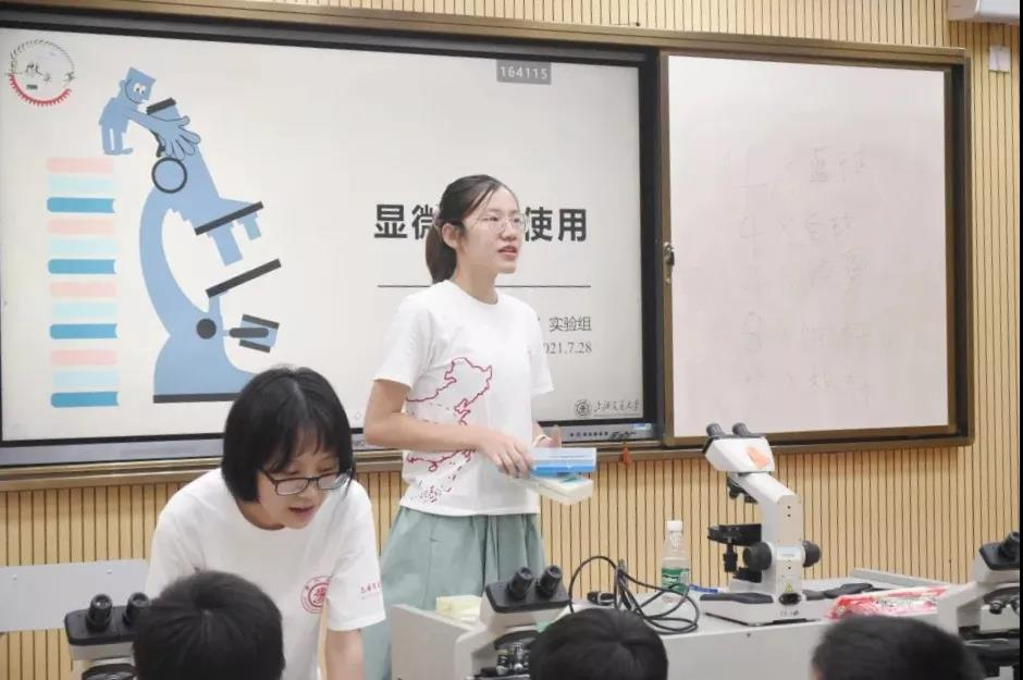 在实验课程中,实践团成员于文丽、郭映哲为孩子们细致讲解了光学显微镜的使用方法以及细胞结构,指导孩子们使用显微镜观察装片。孩子们领略到了新奇的微观世界,锻炼了动手能力,开阔了视野,激发了对生命科学的兴趣。