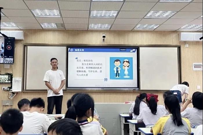 在职业规划讲座上,实践团成员顾睿初向他们介绍了多种职业,并引导同学们结合自身兴趣及特长进行职业规划探索,树立远大理想。此外,为了让孩子们更好地了解生命科学领域的科研工作,顾睿初结合国际基因工程机器大赛(iGEM),简单介绍了生物学研究的基本方法,带领孩子们亲手拼接DNA双螺旋模型,使孩子们感受到了生命科学的魅力。孩子们由此展开了对于未来的畅想。