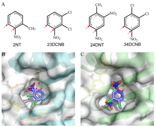 研究表明JS3030和JS3051均通过Rieske家族的非血红素双加氧酶催化3,4-二氯硝基苯和2,3-二氯硝基苯代谢起始的双加氧反应,分别生成4,5-二氯邻苯二酚和3,4-二氯邻苯二酚,后续由氯邻苯二酚1,2-开环酶催化开环反应形成二氯黏糠酸,并逐步进入TCA循环(图1)。尽管他们代谢途径相似,但其基因来源确大不相同。分析表明3,4-二氯硝基苯双加氧酶(Dcn)与2,4-二硝基甲苯双加氧酶来源相同,而2,3-二氯硝基苯双加氧酶(Dcb)与2-硝基苯双加氧酶来源更近(图2左)。通过分析硝基芳烃双加氧酶的结构发现,其活性口袋与底物取代基团的适配性决定了其进化来源(图2右)。本研究不仅揭示了两种难降解硝基芳烃的代谢途径及机制,同时拓宽了我们对于该类化合物的微生物代谢途径快速进化的认知。