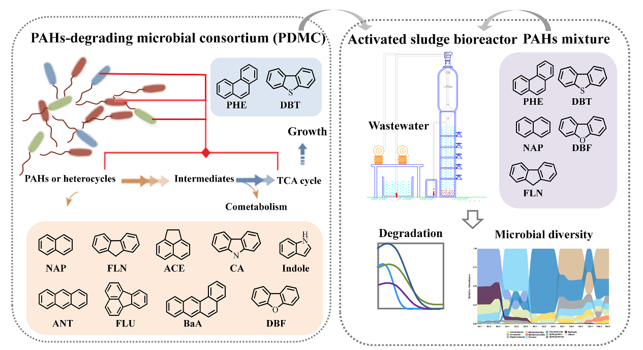 另一个与多环芳烃降解相关的研究则聚焦于从污染环境中富集得到的一个高效降解菌群PDMC,本研究对其群落组成、生长和降解特性均进行了初步探究。当以菲为唯一碳源进行生长时,菌群PDMC的平均降解速率为6.67 mg/L/h,是目前已报道的降解速率最快的菲降解菌群之一。同时,该菌群能通过共代谢方式降解萘、苊、蒽、芴、荧蒽、苯并[a]蒽、二苯并呋喃、咔唑和吲哚共9种底物。通过检测这些底物的中间代谢产物可知,菌群PDMC拥有丰富多样的PAHs降解途径。利用活性污泥反应器和工业废水模拟了菌群PDMC对PAHs混合污染的水体修复,该菌群可在5 d内实现混合底物的全部降解,并在四轮反应中始终具有优秀的混合PAHs降解能力。结合水体修复过程中的群落多样性变化可知,菌群PDMC可成为PAHs污染环境修复的强有力的候选菌株(图2)。相关研究成果“Microbial degradation of multiple PAHs by a microbial consortium and its application on contaminated wastewater”发表于《Journal of Hazardous Materials》,博士生张莉鸽为第一作者,唐鸿志教授为通讯作者。