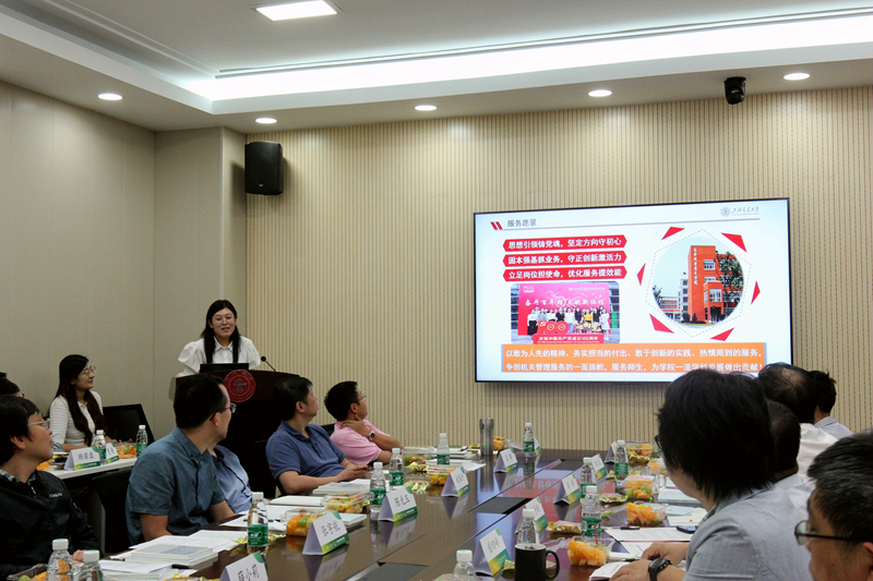 学院科研办主任解丛君从学院机关职能定位、成员分工和科室设置三方面介绍机关科室,展示了学院管理服务队伍的精神风貌。送服务,办实事,为学院一流学科发展作出贡献。