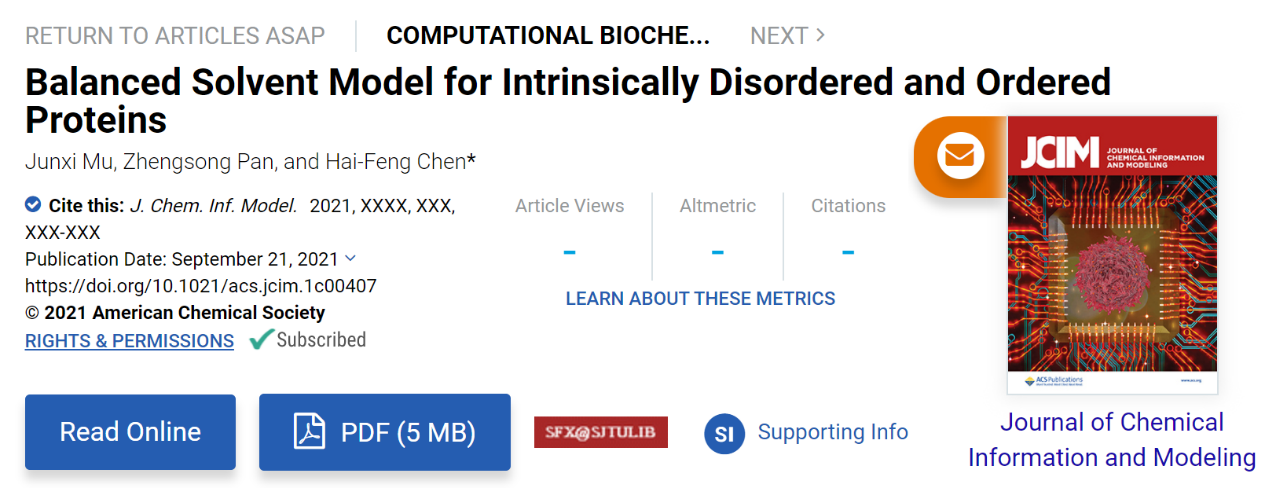 近日,36365线路检测登录入口本科生在《J. Chem. Inf. Model.》期刊在线发表名为Balanced Solvent Model for Intrinsically Disordered and Ordered Proteins的研究成果,该研究为天然无规蛋白的功能研究提供了一种新的溶剂化模型。36365线路检测登录入口陈海峰教授课题组的本科生穆俊曦与潘政松为共同第一作者,陈海峰为通讯作者,36365线路检测登录入口生物信息学与生物统计学系为该文章第一通讯单位。