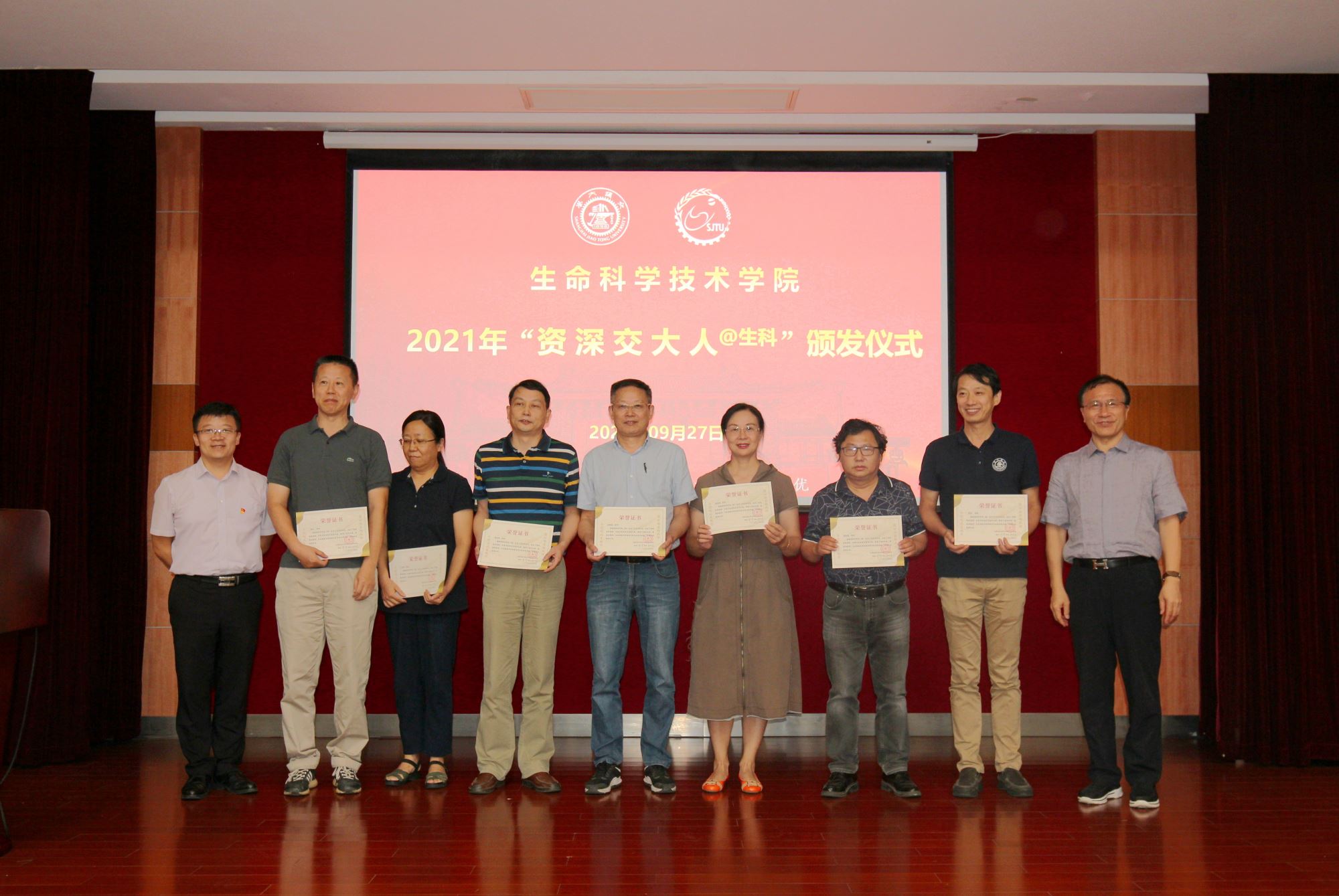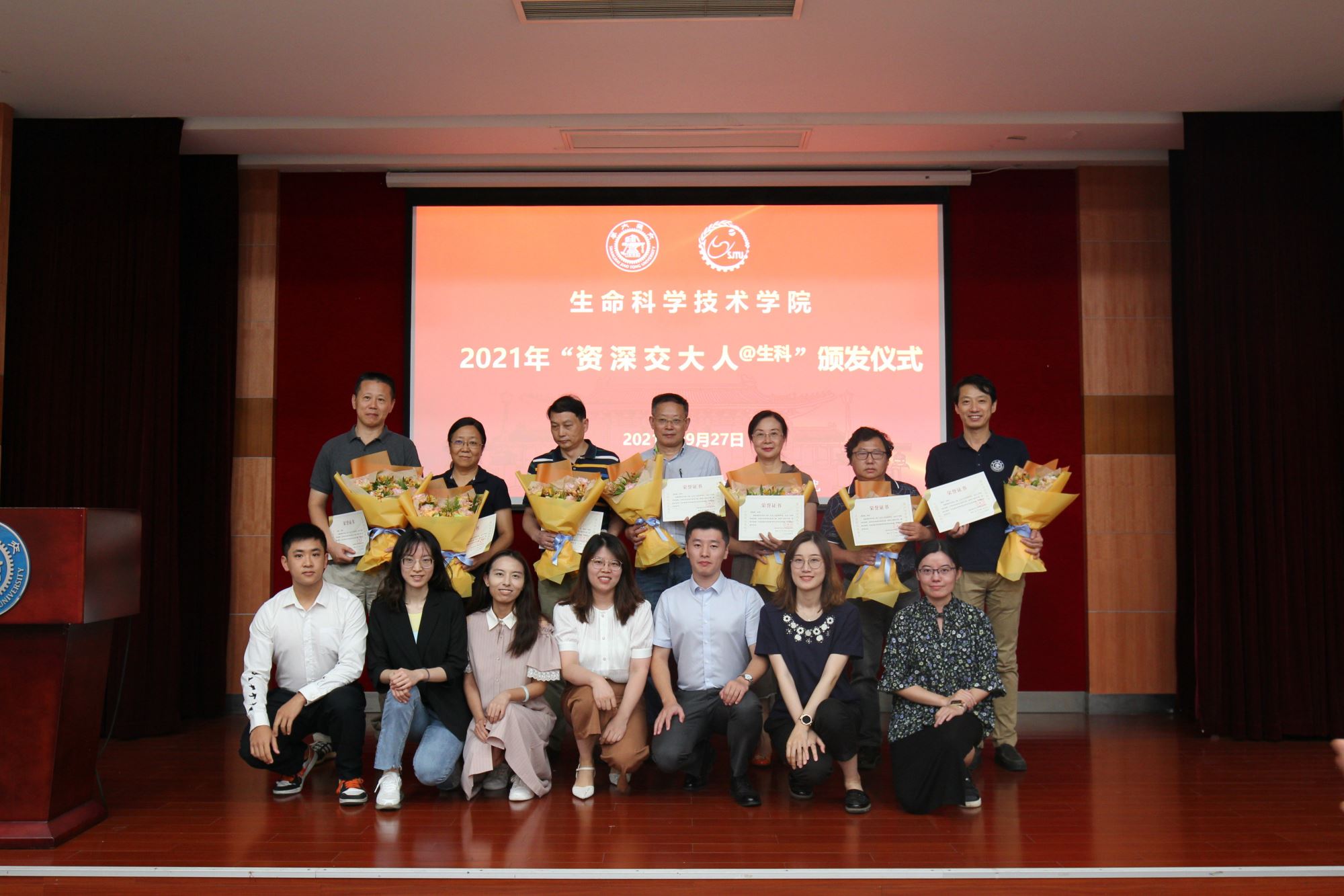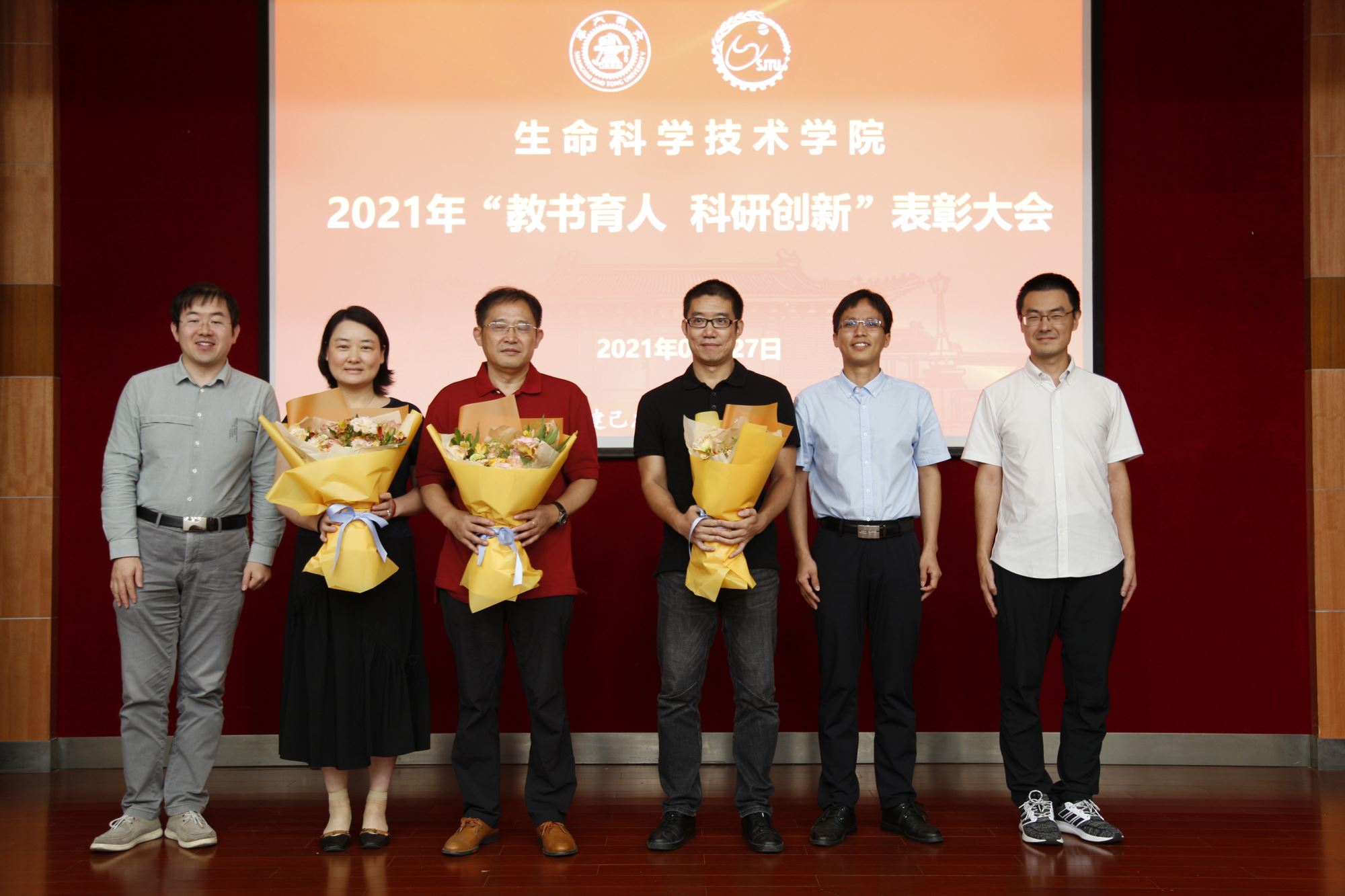 大会表彰了2021年校教书育人奖、科研成果奖的获奖教师及团队,以及学院“资深交大人”荣誉称号获得者。院长邓子新和嵇绍岭为获奖教师代表颁奖,学院新入职青年教师向老教师献花。