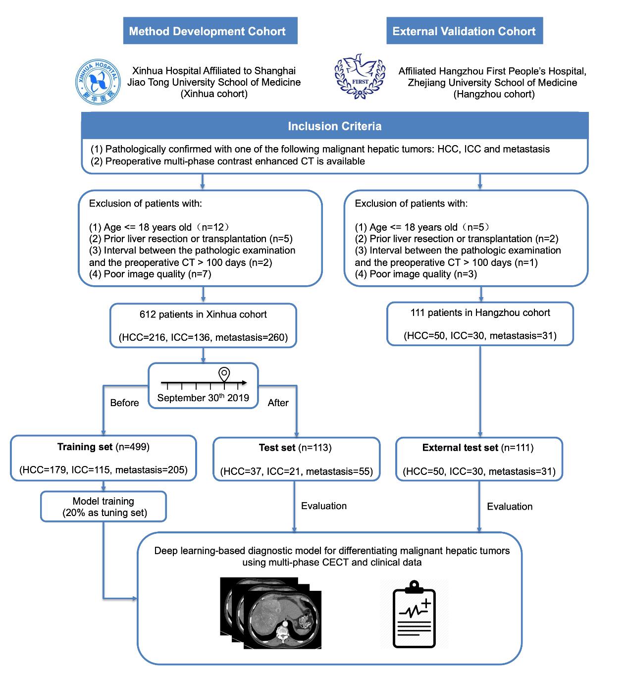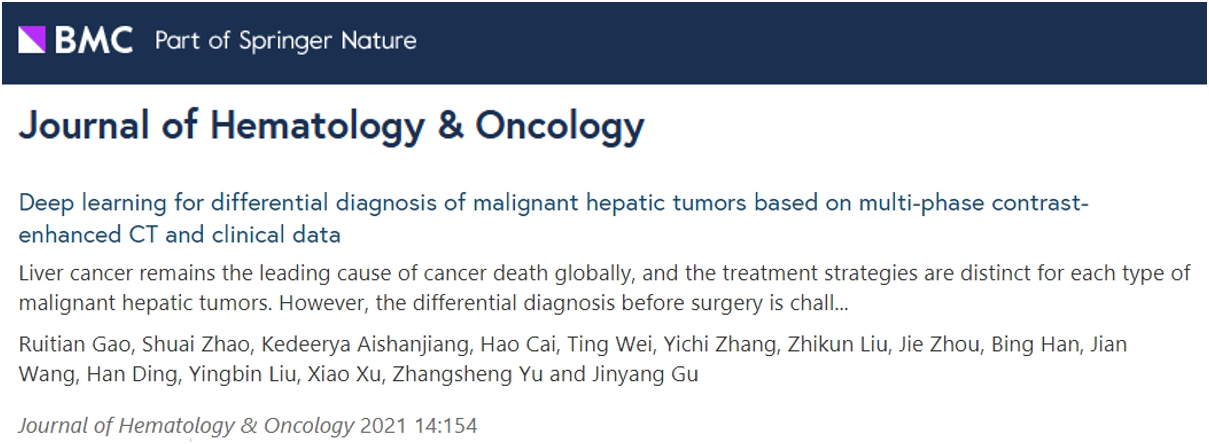 肝恶性肿瘤包括肝细胞癌(HCC)、肝内胆管细胞癌(ICC)和转移性肝癌等,是常见且预后极差的恶性肿瘤。影像学诊断为治疗决策和预后判断提供了不可或缺的支持,然而不同肝恶性肿瘤通过影像学诊断常有误诊。临床上不同肝恶性肿瘤的治疗策略差异巨大,医生在手术、靶向、免疫等治疗前对患者肿瘤类别的准确诊断至关重要。2021年9月26日,医学院附属新华医院顾劲扬教授团队、36365线路检测登录入口俞章盛教授团队、杭州市第一人民医院徐骁教授团队、医学院附属仁济医院刘颖斌教授团队合作在国际血液病学和肿瘤学知名期刊Journal of Hematology & Oncology上发表了题为“Deep learning for differential diagnosis of malignant hepatic tumors based on multi-phase contrast-enhanced CT and clinical data”的研究成果,提出了一种运用深度学习基于患者术前多期造影增强CT和临床数据对肝脏恶性肿瘤进行判别的智能诊断系统,达到与资深放射科医生相当的判别水平。更可喜的是,在该系统辅助下,放射科医生诊断准确率得以提升,结果在多中心数据中得到验证。该系统可以作为辅助诊断工具,指导医生鉴别肝恶性肿瘤,有望为医疗欠发达地区提供强有力的影像学诊断支持,并提高三甲医院放射科的诊断准确率,为肝癌患者制定最佳治疗方案,促进肝癌的精准治疗。