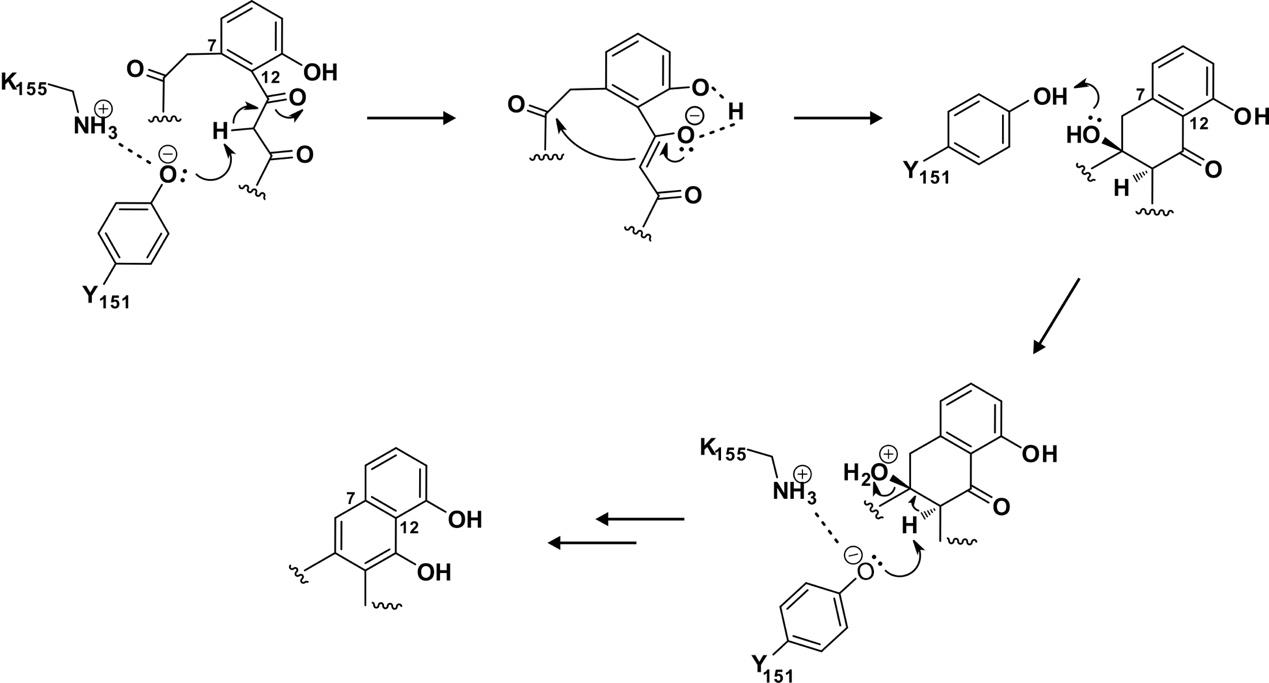 II型聚酮化合物是小分子临床药物的重要来源,如化疗药物阿霉素和光神霉素、临床抗生素四环素等。它们生物合成过程及蕴含的生物化学机制,尤其是碳骨架的生物合成机制研究,依然存在较大挑战亟待细致研究。其中,II型聚酮化合物的成环方式对它们的结构多样性和生物活性至关重要,探究它们的环化机制对发现新颖的酶催化反应具有重要意义。SDR家族蛋白是最大最多样化的NAD(P)依赖酶超家族之一,已知的SDR家族蛋白超过47,000个。但据我们所知,目前并没有关于SDR家族蛋白作为II型聚酮环化酶案例的报道。