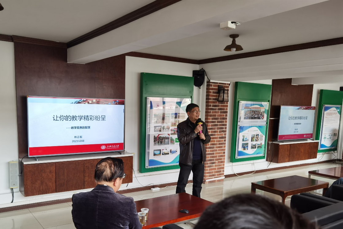 林志新教授作教学经验分享。他指出,教学竞赛的宗旨是“以赛促建、以赛促用、以赛促改”,不是为竞赛而竞赛,而是为追求提升教学能力而竞赛。随后,他盘点了当今高校中主要的四类教学竞赛类型,即:高校教师教学创新大赛、混合式教学设计创新大赛、青年教师教学竞赛和全国高校微课教学比赛。林志新分别对四类教学竞赛进行详细介绍,并列举我院历年参赛的战绩,对获奖作品进行展示和点评。