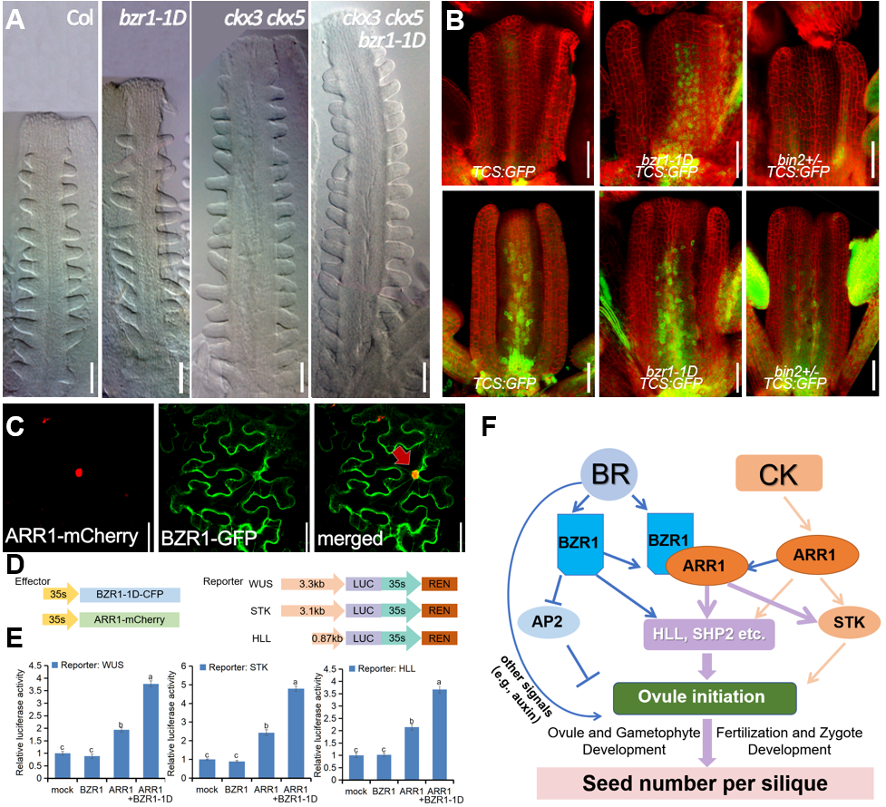 种子是高等植物的生殖器官,种子数量对植物繁衍后代和农作物产量至关重要。胚珠(种子前体)发生和发育、配子体发生和发育、雌雄互作、合子发育等过程都会影响最终种子数。其中胚珠发生决定了胚珠数的最大可能性,并在很大程度上影响种子数;同时胚珠发生是细胞命运决定和器官发生的过程,因此研究胚珠发生的调控机制具有重要科学意义和潜在应用价值。拟南芥油菜素甾醇(BR)和细胞分裂素(CK)的信号增强突变体是已知最明确提高单果实种子数(角粒数)的材料,但其调控机制还不清楚;并且BR和CK互作机制和信号网络也有待进一步探究。