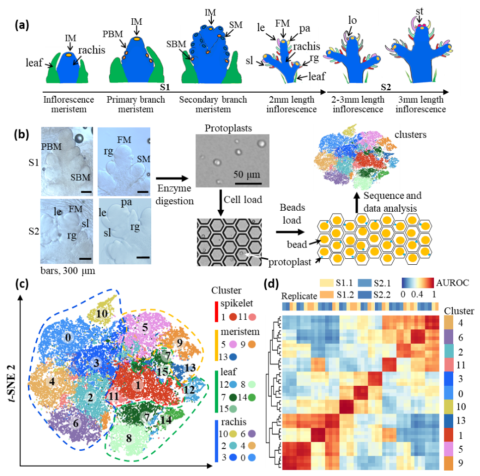 (a) 水稻花序早期发育模式图。(b) 实验流程,展示花序早期发育两个时期材料的取材、原生质体收集、细胞捕获、单细胞转录组测序和生物信息学分析的工作流程。(c) t-SNE分类算法将花序细胞分为小穗、分生组织、轴、叶四大类群。(d) AUROC(area under the receiver operator characteristic curve)分析展示样本之间的高重复性。
