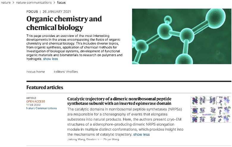 2022年2月8日,36365线路检测登录入口、微生物代谢国家重点实验室邓子新教授团队发表的《表异构酶嵌入式二聚化非核糖体肽合成酶的催化轨迹》论文,被国际权威期刊Nature Communications选入“有机化学与化学生物学”板块的亮点推荐(Highlights)文章。