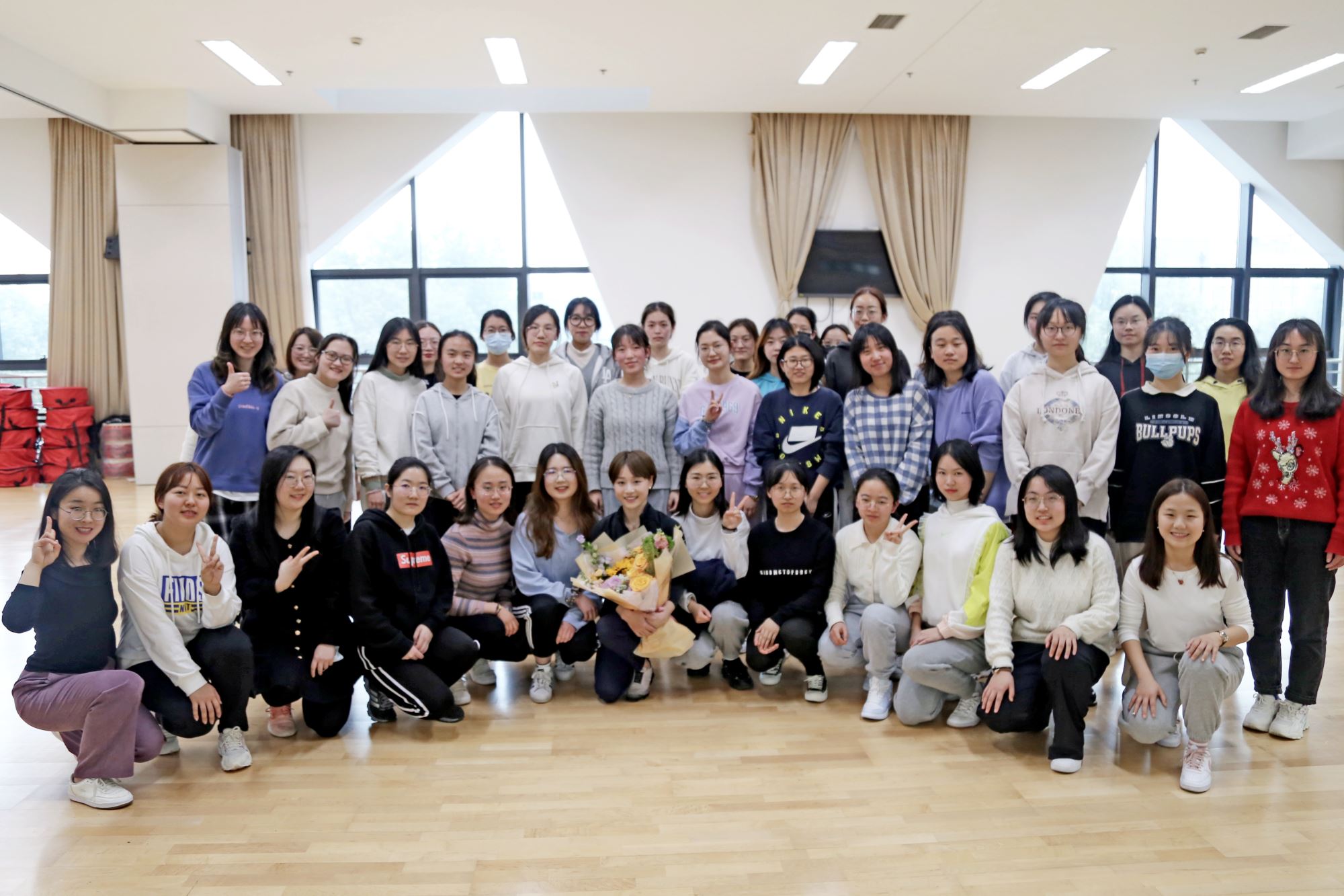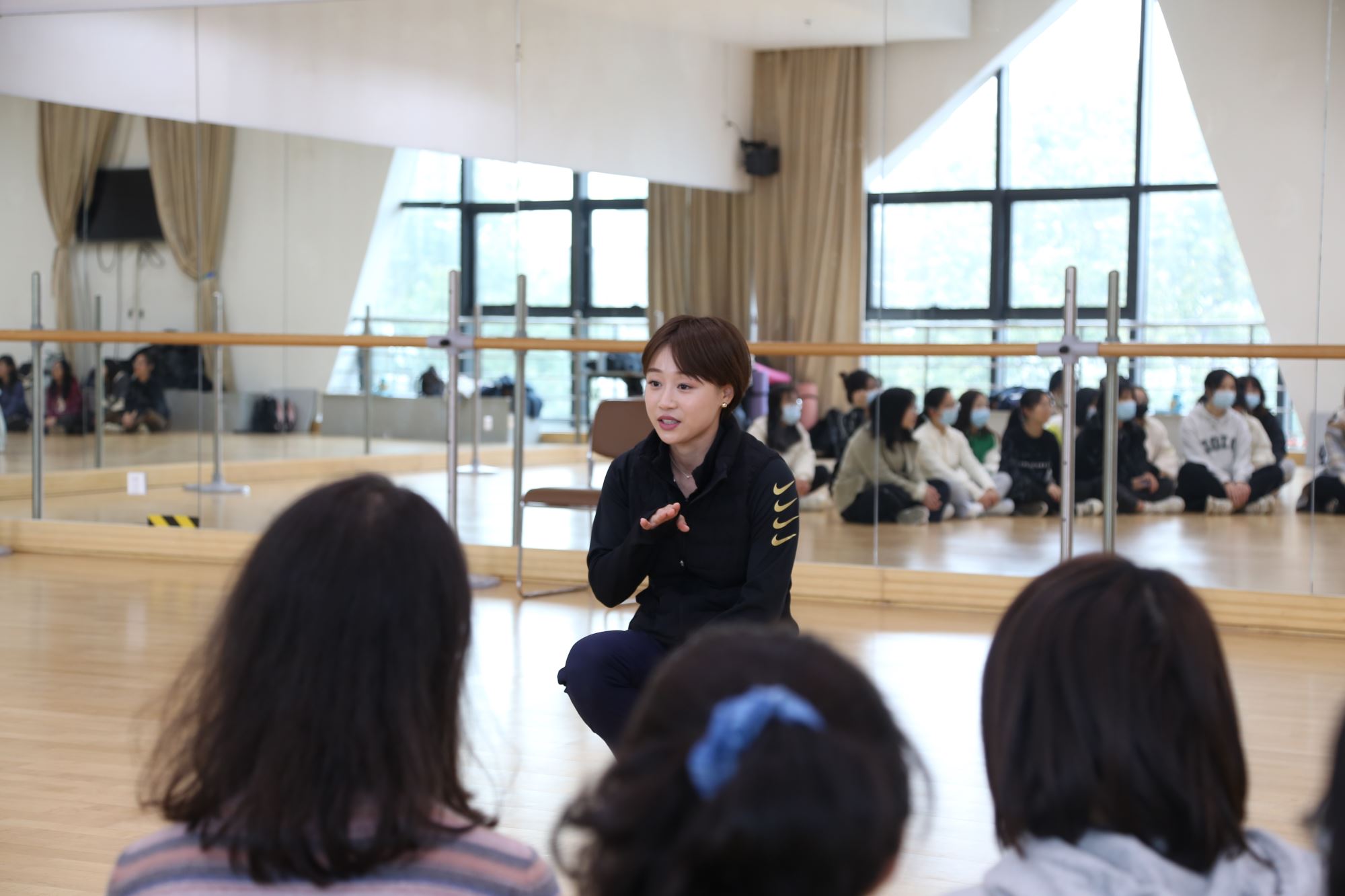 在讲述成长故事后,眭禄对同学们进行形体指导,带领大家做热身、拉伸、柔韧练习,并讲解了女性形体训练的重要性及体育运动对身心健康的积极作用。