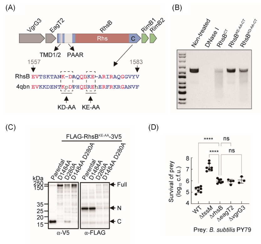 图2:效应蛋白RhsB的酶学活性、自剪切特性和分泌途径。(A) rhsB的基因簇。(B) RhsB具有降解DNA的活性。(C) D1484A和D280A突变能够抑制RhsB的自我剪切。(D) 敲除RhsB载运蛋白或伴侣蛋白基因减弱了AAC00-1对革兰氏阳性菌的杀伤能力。