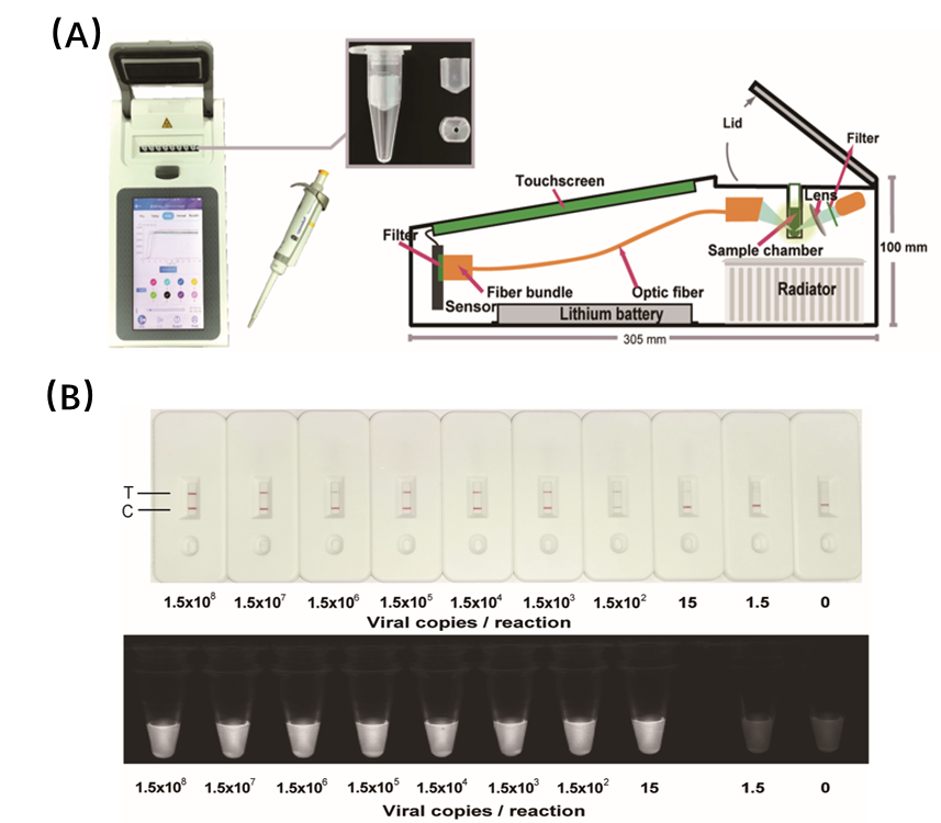 图3. MULAN技术与便携式检测设备(A)、检测试纸及蓝光照射(B)结合