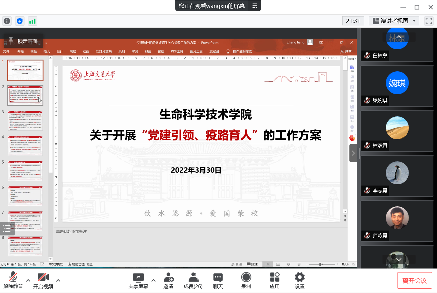 共同观看了中共中央政治局关于新冠疫情防控形势的视频,强调了中央关于疫情防控工作的精神,即“人民至上,生命至上”。随后分享了师生参加抗疫工作的情况。