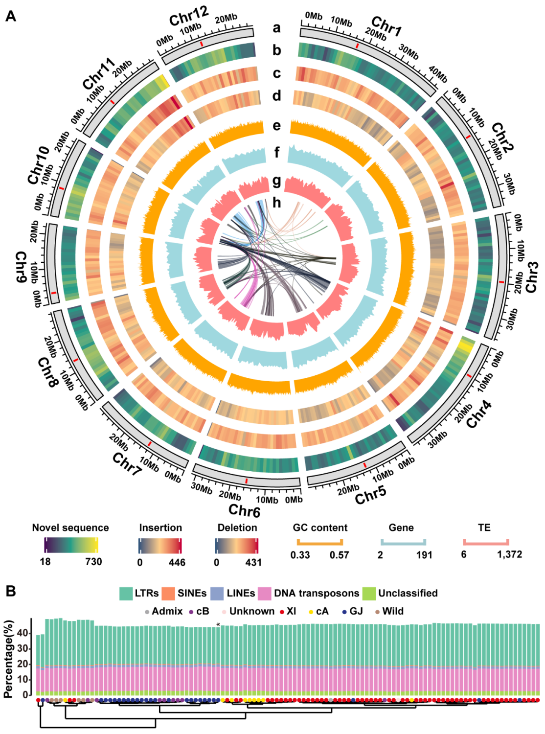在111 个水稻构建的高质量泛基因组中包含879 Mb 的非冗余新序列(序列相似度<90% ,长度> 500bp)。新序列中近一半为长末端重复(LTRs)逆转录元件Gypsy。新序列分布在每条染色体上,Chr1 包含最多数量的新序列,而 Chr11 具有最长长度的新序列。除了 Chr4 和 Chr11 的端粒附近的两个峰以外,含有高密度新序列的基因组区域倾向于位于着丝粒附近。在所有水稻基因组中,野生稻包含的重复序列 LTRs 明显多于栽培稻。在水稻泛基因组新序列中共发现19,319 个新的蛋白质编码基因(2,132 个新基因家族)。在所有基因家族中,约80%是核心或软核心(存在于所有样本中或者存在于超过 90% 的样本中),约20%是非必需的。