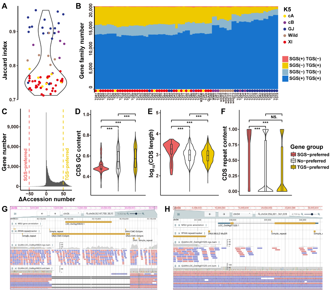 为了探究测序技术对泛基因组构建及分析的影响,该研究分别比较了75个水稻品种的二代和三代测序数据构建的泛基因组及其基因的存在和缺失结果(基因PAV)。将基因分为三组(TGS偏好的、SGS偏好的和无偏好的)后,与SGS偏好的基因相比,TGS偏好的基因具有更高的GC含量和更短的CDS长度。大多数 SGS 偏好的基因的所有 CDS 区域都与重复元件重叠,这与 DNA 转座子和 LTR 相关。然而,具有较高LINEs和 RC/Helitron比例的基因在 TGS 中比在 SGS 中更频繁地被检测到。这些结果表明,SGS数据在检测基因PAVs时往往会得到更高的假阳性率,尤其是对于包含重复序列的基因。