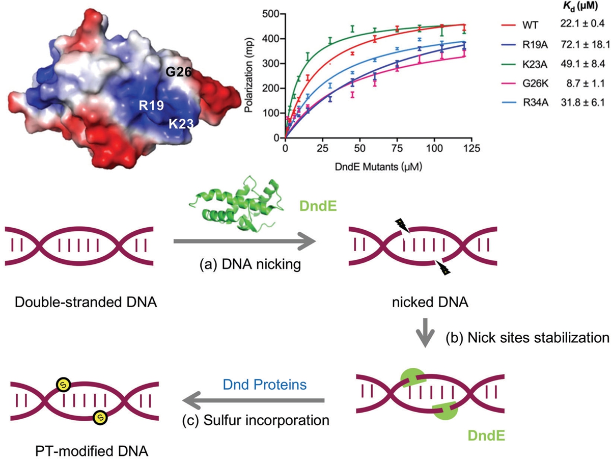 本研究首先通过解析嗜盐碱古菌Natronorubrum bangense JCM10635菌株的DndE蛋白的晶体结构,发现与之前发表的大肠杆菌B7A菌株的DndE形成四聚体不同,古菌的DndE蛋白在晶体中和在溶液中都是以单体的形式存在。接着,本研究通过采用纯化的DndE蛋白在体外对DNA的缺刻(nicking)实验检测发现,与II型DNA硫化修饰系统SspABCD中的SspB蛋白类似,DndE具有对DNA的缺刻活性,将共价闭环(covalently closed circular)双链DNA的其中一条单链切断,即将DNA缺刻,产生开环(open circular)DNA,并随着时间的逐步推移,产生线状(linear)DNA。而且,本研究还揭示,DndE的这种对DNA的缺刻活性依赖于二价金属阳离子,特别是镁离子,而不依赖于DNA上存在或不存在磷硫酰化修饰。Run-off测序结果显示,DndE对DNA的缺刻活性也没有DNA序列特异性。然后,通过采用在体外的荧光标记的DNA与纯化的DndE蛋白的荧光偏振检测实验表明,DndE蛋白可以在体外与DNA直接结合,而且,DndE与缺刻DNA的亲和力最强,与双链DNA的亲和力次之,与单链DNA的亲和力最弱。最后,本研究发现将DndE蛋白表面带正电荷的精氨酸19、赖氨酸K23和精氨酸R34突变为电中性的丙氨酸的话,会降低DndE与缺刻DNA之间的亲和力;而如果将DndE蛋白的甘氨酸26突变为带正电荷的赖氨酸的话,会增强DndE与缺刻DNA之间的亲和力。这说明DndE蛋白通过其表面带正电荷的氨基酸残基如精氨酸19、赖氨酸K23和精氨酸R34等来结合缺刻DNA。