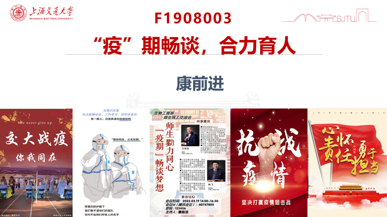 生工系本科生班主任积极响应倡议,4月23日下午,2019级生工班康前进老师组织了师生线上交流会,邀请了白林泉教授、唐鸿志教授和欧一新老师与同学们就学习、生活和思想方面进行了深入交流。