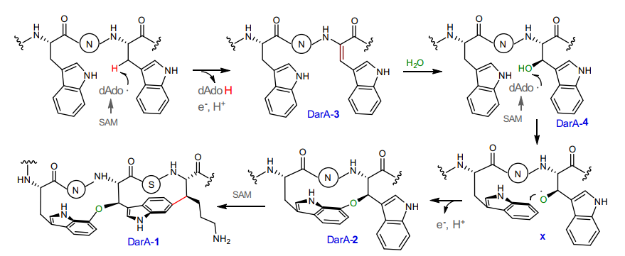 由于革兰氏阴性菌特殊的荚膜结构,其对大部分抗生素都具有抗性。开发和研究新型革兰氏阴性菌抗生素对于未来人类的生活和健康具有重大的意义。Darobactin是2019年从嗜线虫发光杆菌的代谢产物中发现的一种新型核糖体肽(RiPP),其对于多种革兰氏阴性菌具有优良的抗菌活性,是自上世纪60年以来发现的第一个具有新骨架的革兰氏阴性菌抗生素。Darobactin含有一个罕见的醚键-碳碳键双环交联结构,能以高亲和力靶向结合细菌外膜BamA蛋白,抑制外膜蛋白的装配。Darobactin的生物合成基因簇含有5个基因:darA编码前体肽,darE编码SAM自由基酶DarE,darBCD编码ABC型转运蛋白。本研究通过一系列体内和体外反应,首次揭示了单独的SAM自由基酶DarE能够催化前体肽DarA 核心区氨基酸W1和W3之间形成C-O-C键、K5与W3之间形成C-C键,形成分子中的特征的双环结构。