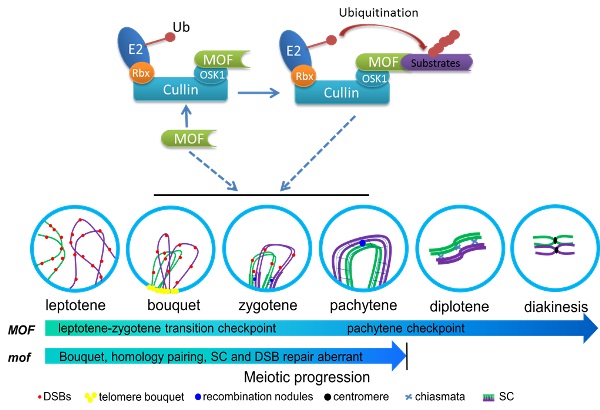 本研究通过对一个F-box蛋白基因MOF的克隆和功能分析,揭示了蛋白泛素化途径在水稻雄性性母细胞减数分裂过程中重要作用。水稻mof突变体的雄性孢母细胞不能进行正常的减数分裂,细线期不能形成端粒束,同源染色体不能完成配对、同源重组等过程。雄性孢母细胞发育停滞在减数分裂I粗线期之前,随后DNA发生碎片化,促发细胞凋亡导致完全的雄性不育。水稻减数分裂过程中,同源染色体的配对和重组依赖于DNA双链断裂(double strand break,DSB)的形成和修复。该项研究证明MOF突变影响了DSB修复相关蛋白在染色体上定位,导致DSB修复无法完成。这项研究工作第一次报道了F-box类蛋白在植物性母细胞发育及减数分裂过程中的调节作用,为阐明泛素化途径在减数分裂过程中的作用机制提供了新的认识。