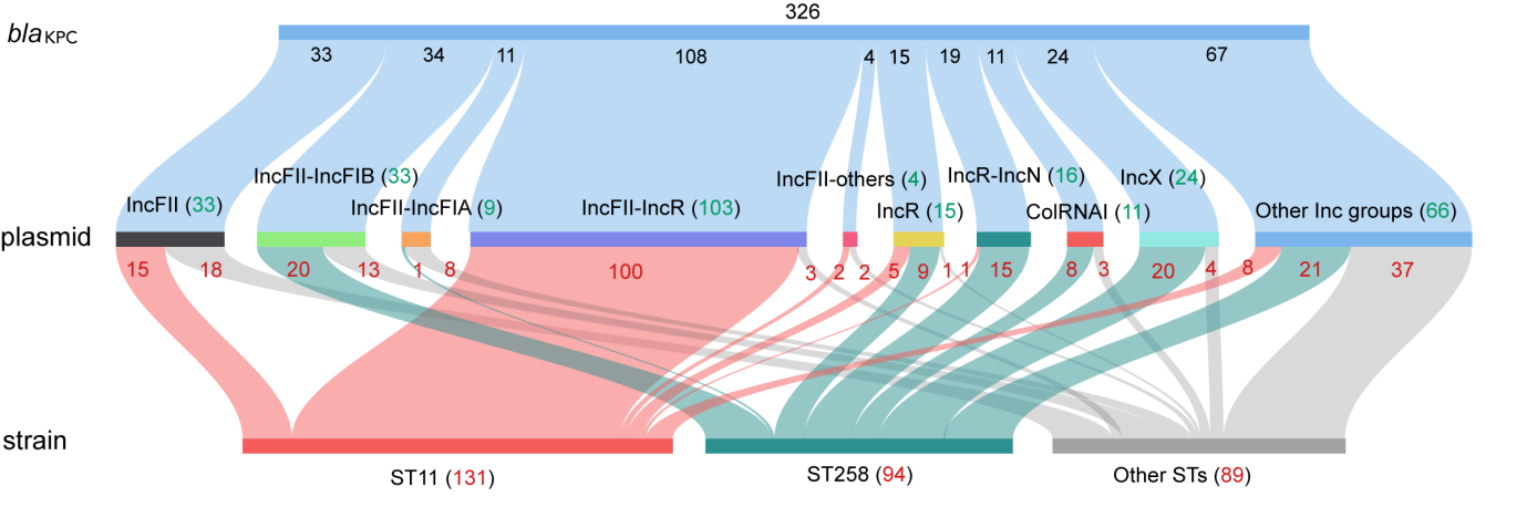 针对ESKAPEE临床株耐药区结构变异的分析需求,VRprofile新版本进行了全新的算法设计和软件实现。在算法设计方面,VRprofile使用“功能模块为主,序列特征为辅”的方法,基于保守基因簇的共定位来识别整合性接合元件等复杂的移动元件。VRprofile它在精准识别不同移动元件的基础上,提出了评估单个细菌中可移动基因组含量的指标mV (mobilome value)。在Web应用方面,VRprofile采用交互式可视化的框架来提供三个特有的分析服务:(i) 一键式识别多种移动元件以及毒力基因和耐药基因,提供了>5500个ESKAPEE细菌移动元件和mV的预计算结果;(ii) 可将识别结果与后台数据库MobilomeDB2收录的一千多个活跃的耐药移动元件进行结构比对,辅助用户解析多重耐药区的结构变异;(iii) 整合病原菌菌株分型和质粒的不相容群和转移潜力等预测功能,为用户探讨“菌型-质粒-耐药基因”的关联性提供便捷的服务,例如下图对碳青霉烯耐药肺炎克雷伯菌的分析。