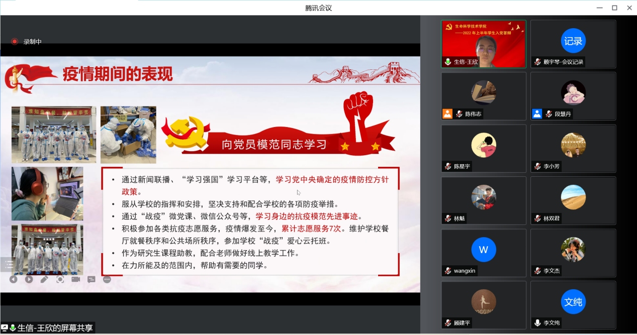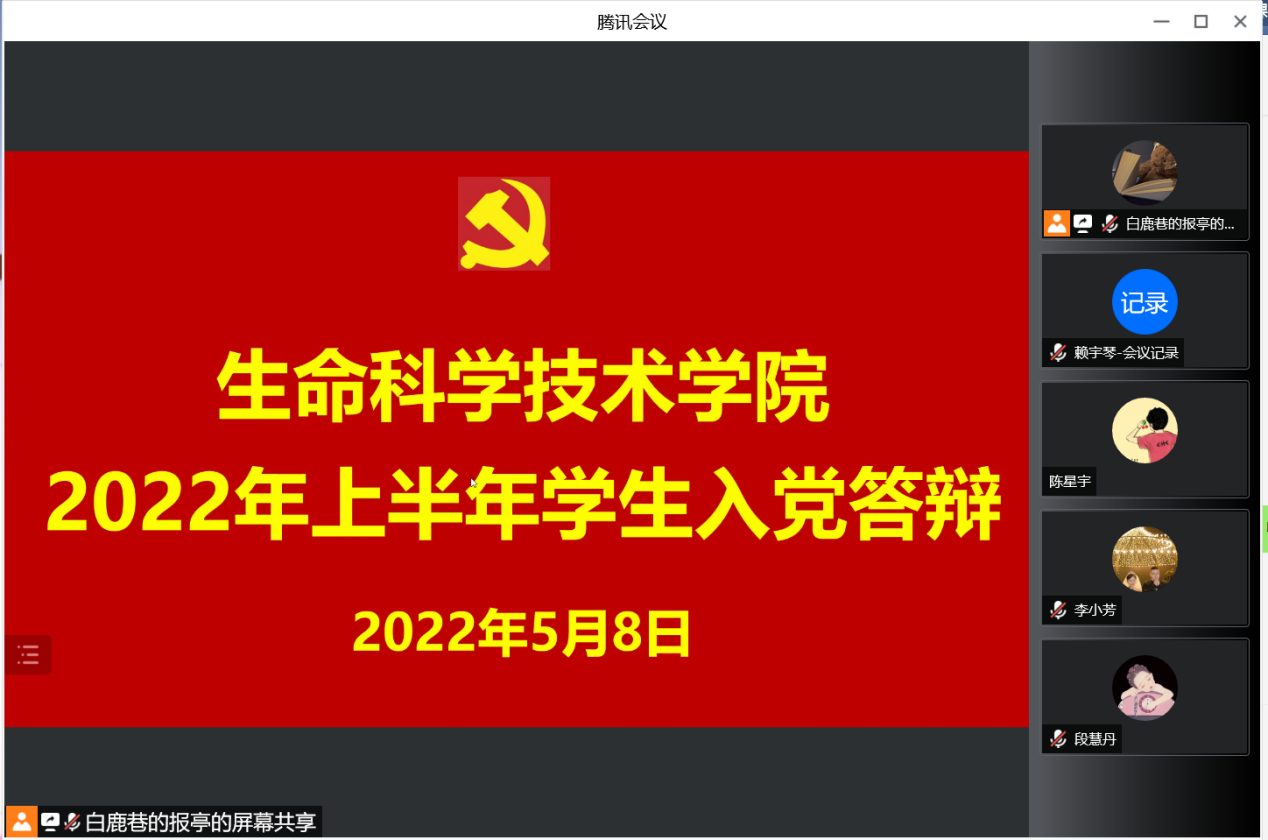 为加强入党积极分子的培养和考察,2022年5月8日,36365线路检测登录入口在线上举行积极分子入党答辩会。学院党委书记顾建平,党委副书记李文纯、王鑫,党委委员、副院长林双君,学生办思政老师李芳、林魁,学生辅导员陈伟志、陈星宇、李文杰出席答辩会并担任评委,会议由学院组织员段慧丹主持。