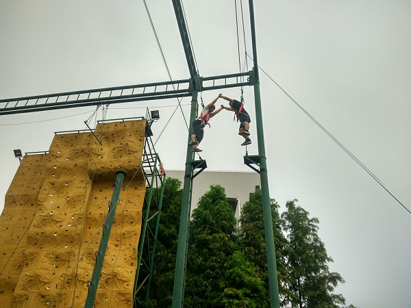专题培训以“突破自我,扬帆远航”为主题,旨在引导本科毕业生党员加强团队合作,鼓励他们在今后的人生道路上勇于突破自我。在“空中抓杠”项目中,学生党员既要克服自身的恐惧,在十米高空勇敢往前跳跃,又要把自己的人身安全完全托付给由其他党员组成的安全保障团队。在“生死共存”项目中,两人一组的合作快速有效地建立起同伴之间的信任。