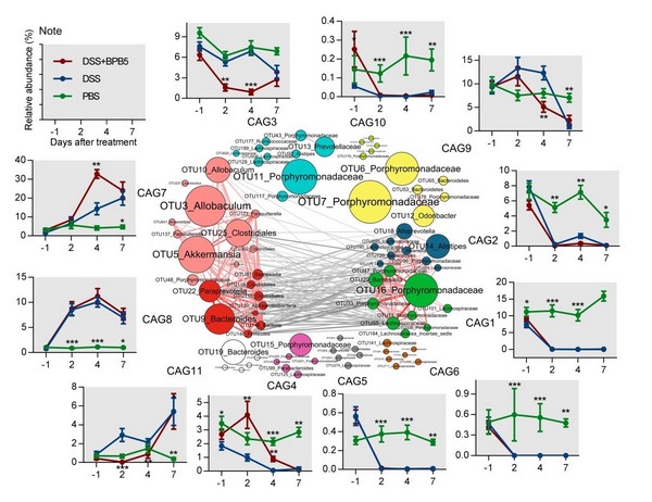 赵立平团队长期从事肠道菌群与人体健康关系的研究,积累发展了丰富的肠道厌氧菌的分离培养相关技术,并能够结合动物模型和微生物组的研究方法对重要菌株进行功能研究。在本研究中,研究团队从一位健康成年男性志愿者肠道样品中分离得到了一株典型的丁酸盐产生菌(Anaerostipes hadrusBPB5),其在体外能够发酵复杂碳水化合物产生丁酸和氢气。动物实验表明,正常小鼠接种BPB5后能够增加宿主肠道内丁酸的含量,BPB5表现出潜在的有益功能。然而,给DSS诱导的肠炎模型小鼠灌胃BPB5后,却显著加重小鼠的病情,增加了动物死亡率。利用高通量测序方法对实验过程中多个时间点小鼠的肠道菌群结构进行动态监测发现,在健康小鼠体内,BPB5的加入不会引起整体肠道菌群结构的显著变化,而在肠炎模型小鼠中,BPB5能够加速DSS引起的菌群失衡。网络分析结果表明,在肠炎模型中,BPB5与一种肠道粘液降解菌以及多种内毒素产生菌呈正相关关系,这几种菌的丰度在BPB5存在时提前3-5天升高到疾病状态的丰度水平,加速了菌群结构的失衡从而导致了小鼠病情的恶化。